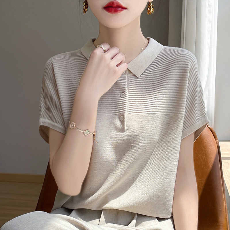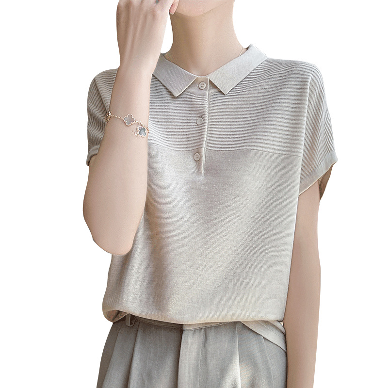 | nameOriginal | Tencel Short-sleeved Women's Doll Collar French Thin Solid Color Loose Knitted Top POLO Lar Button High-grade T-shirt |
