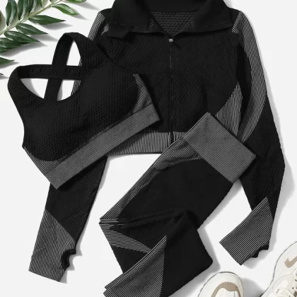| nameOriginal | 3pcs Textured Pinstripe Workout Set Active Wear Crisscross Bra & Thumbhole Jacket & Wide Waistband Leggings |