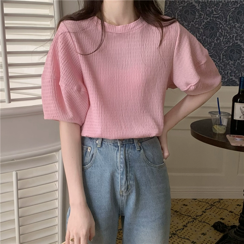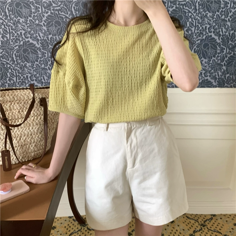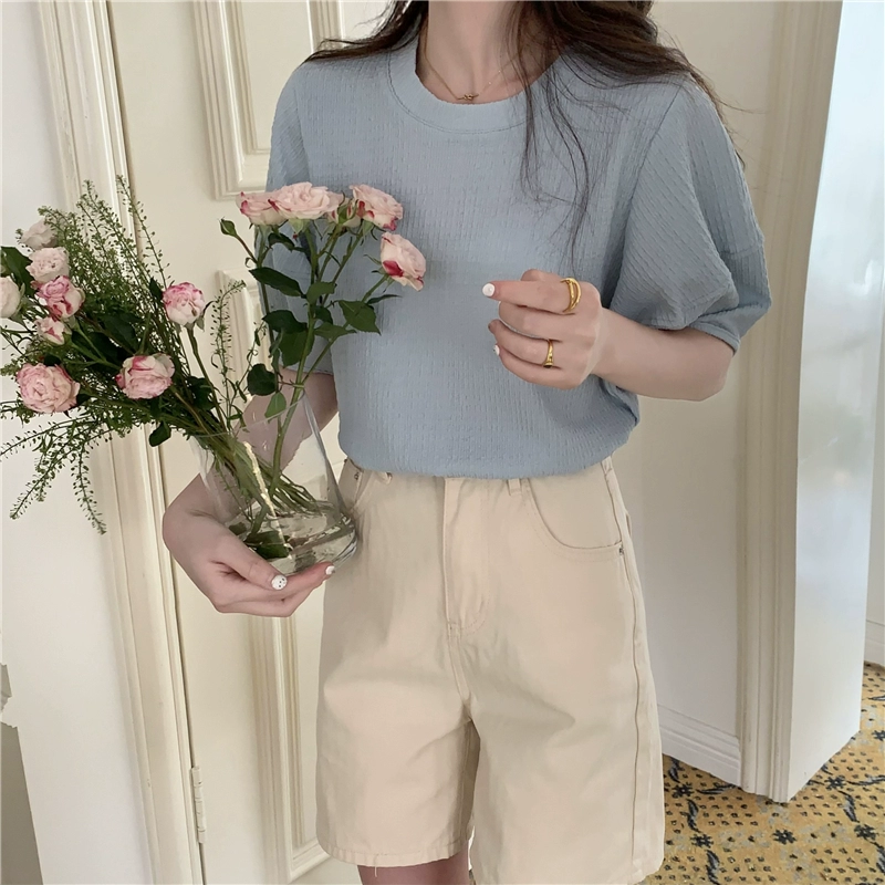 | nameOriginal | Textured right shoulder Korean style top with short sleeves |