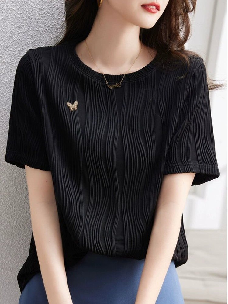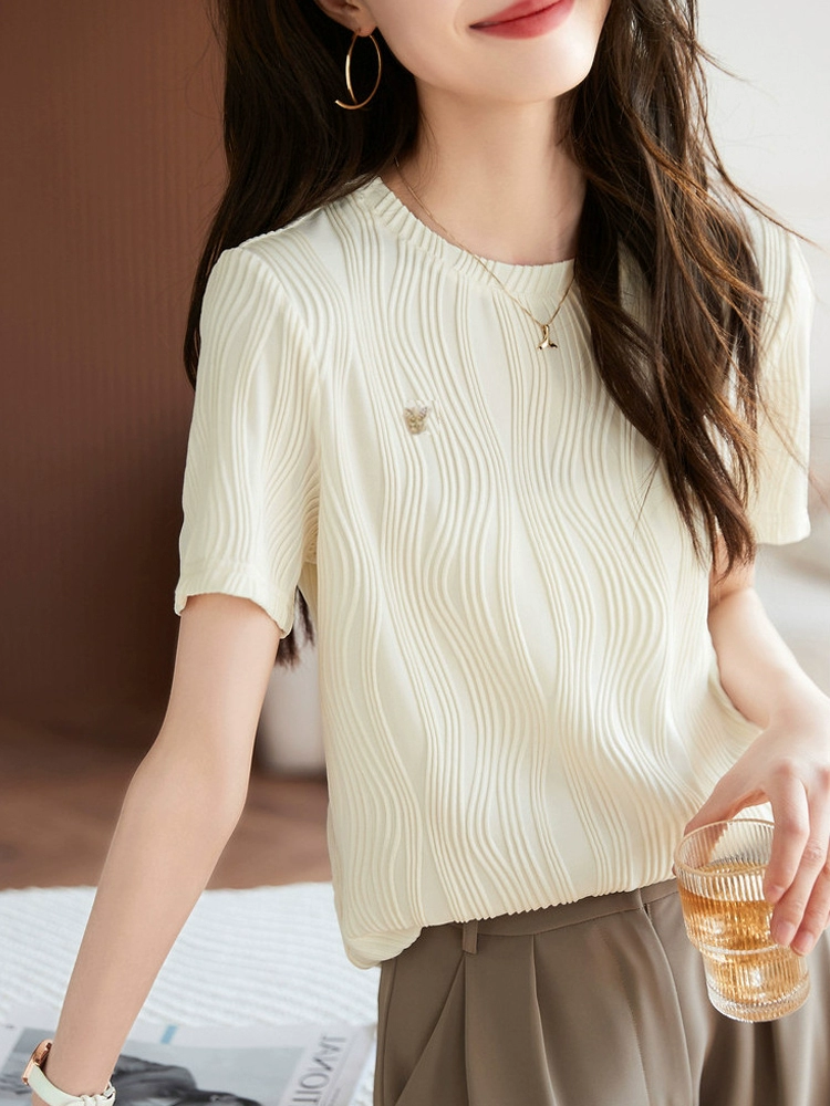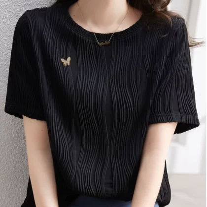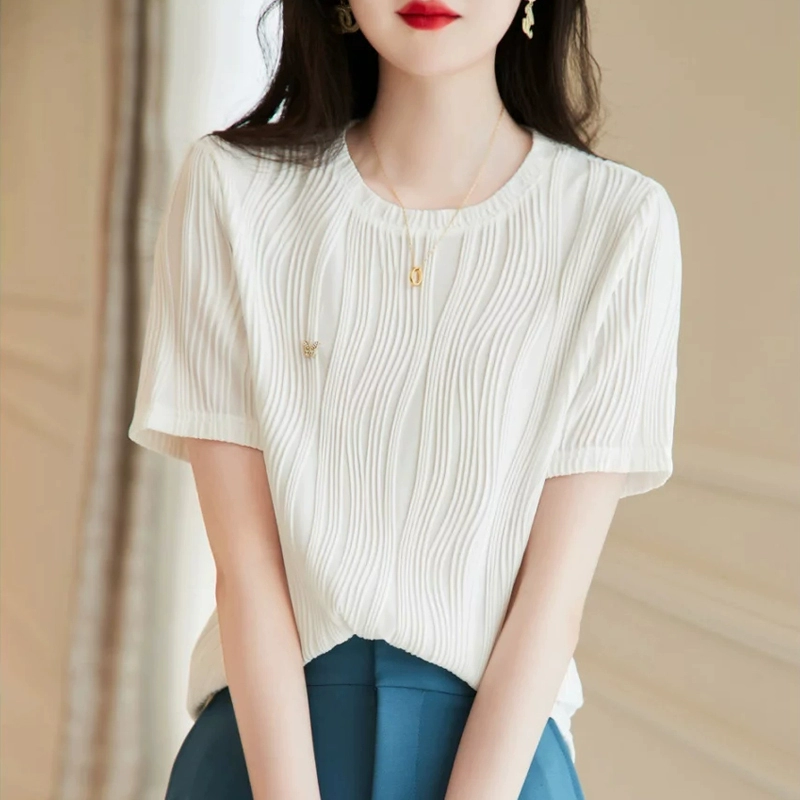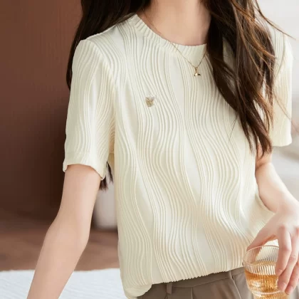 | nameOriginal | Textured round neck slimming striped short-sleeved top for age reduction |