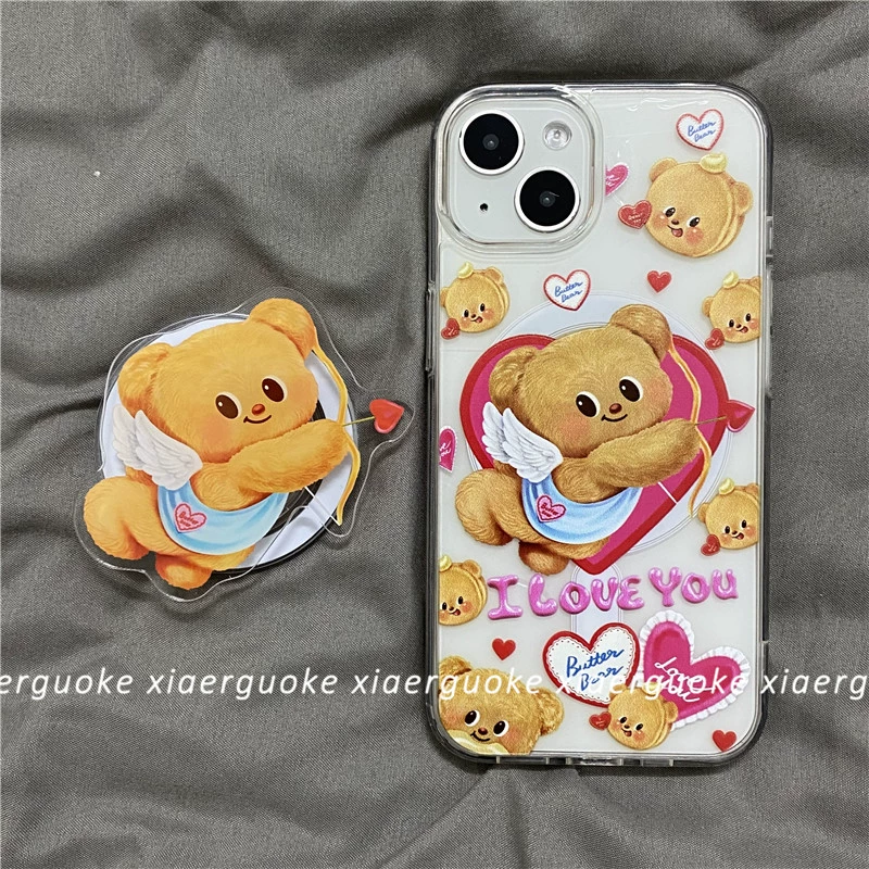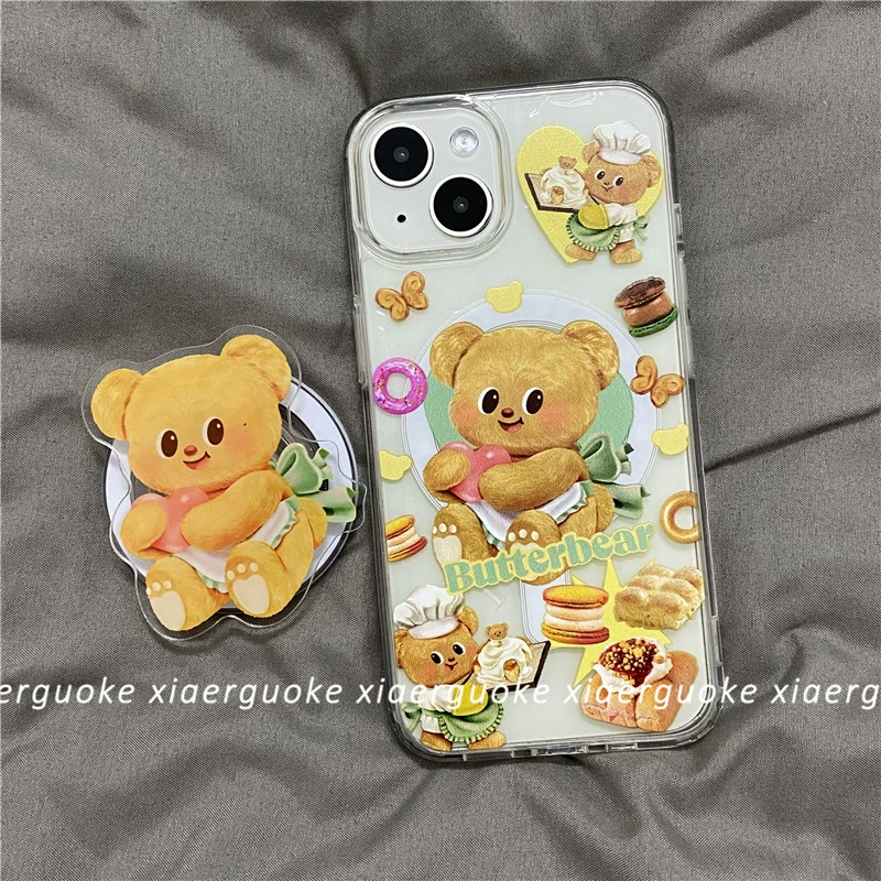 Thai cartoon butter love bear magnetic holder mobile phone case 14promax suitable for Apple 15 hard shell iPhone12 soft edge 13promax anti-fall 11 wireless charging 15plus plush
