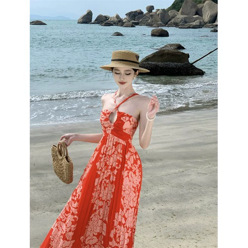 | nameOriginal | Thailand seaside vacation beach dress off-shoulder halterneck pleated dress summer travel wear in Bali and Phuket |