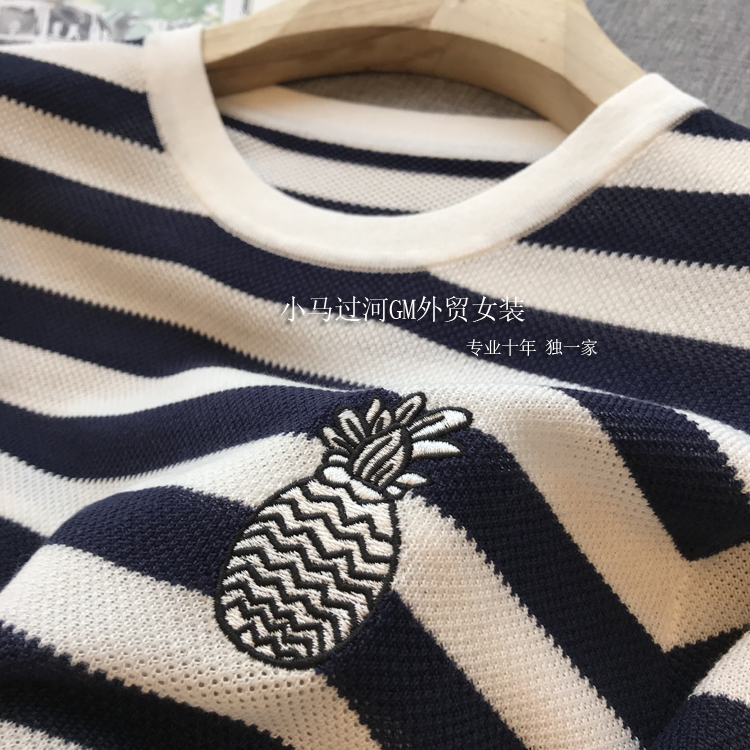 The counter has withdrawn the popular navy style embroidered pineapple striped Tencel sweater short-sleeved spring and summer from international big-name brands.