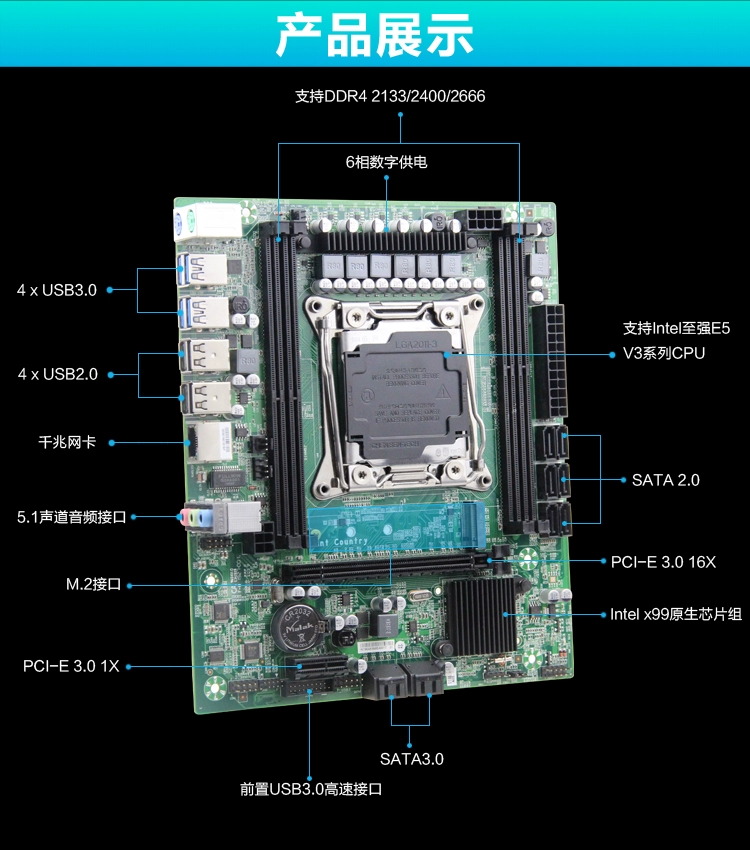The new X99 MATX luxury motherboard’s native X99 chip supports the full range of E5 V3 CPUs, D3/D4 memory