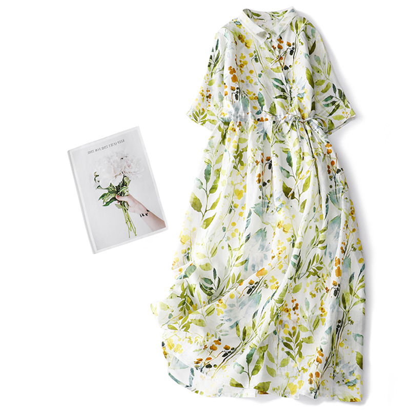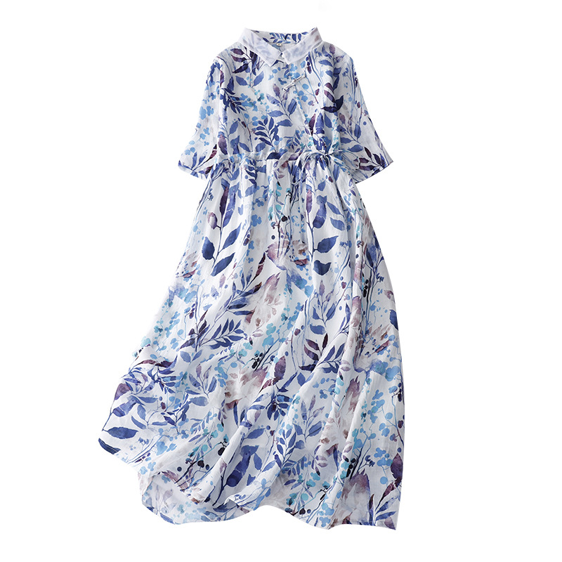 | nameOriginal | The same type of leak-picking ~ ramie light floral temperament slim A- line skirt female summer flax floral waist short sleeve |
