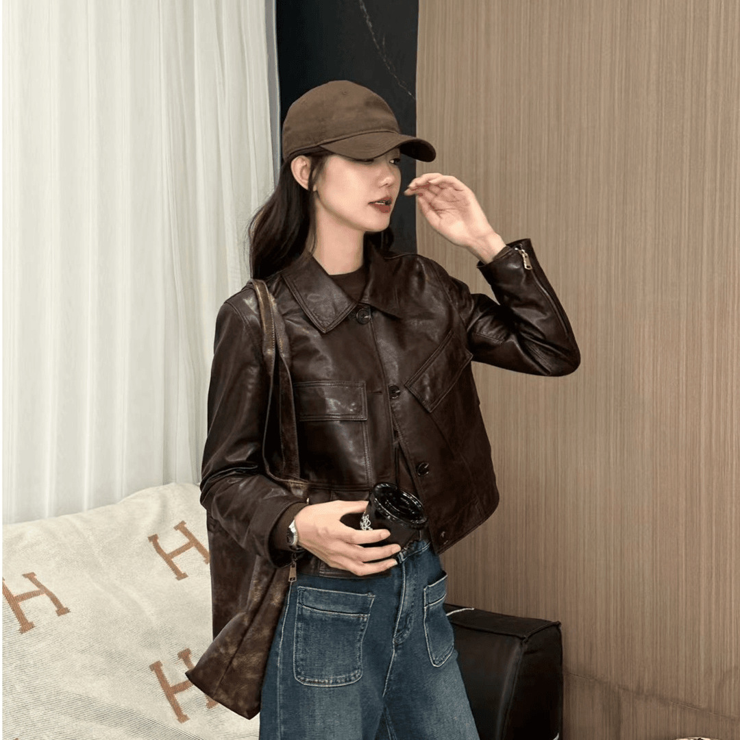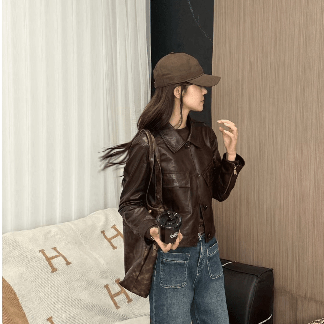 “The Wind in the Forest” Sheepskin Leather Short Coat Women’s Maillard Cafe Leather Leather Autumn and Winter Motorcycle Jacket