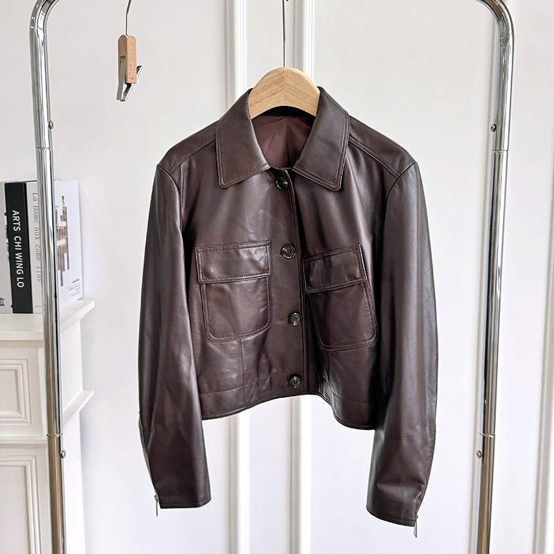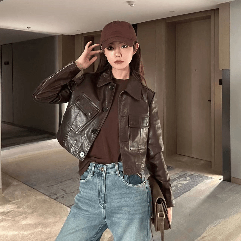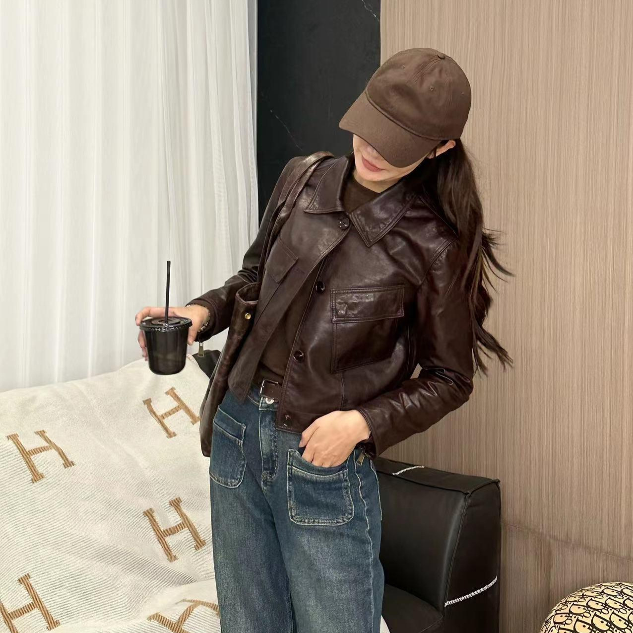 "The Wind in the Forest" Sheepskin Leather Short Coat Women's Maillard Cafe Leather Leather Autumn and Winter Motorcycle Jacket