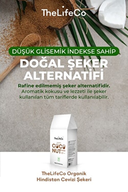 Organic Coconut Sugar 300 Gr TheLifeco Organic Coconut Sugar is a natural sugar that has the ability to keep fresh longer than white sugar thanks to its low glycemic index. Like other sugars, it is not refined and has not been discolored by chemical treatment. Again, since it did not undergo the process, the amino acids, minerals and vitamins in it were protected from damage. As a natural sweetener, this product retains the minerals contained in coconut fruit, such as iron, calcium, zinc. The proportion of fructose in its content is less than refined sugar. Due to its organic, it is a healthy sugar product that does not contain chemical fertilizer or pesticide residues. It has its own pleasant aroma.