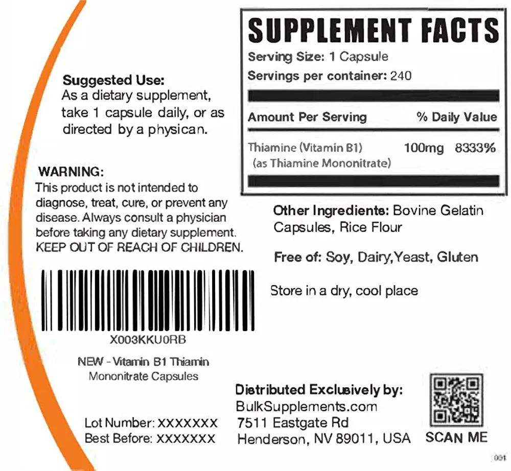 | descriptionOriginal | Description Thiamine Mononitrate capsules or Vitamin B1 capsules by BulkSupplements.com is one of the selections from our vitamin supplements. Vitamin B1 or Thiamine is a essential vitamin for conversion of food and nutrients to energy.* This is Thiamine Mononitrate form. Each capsule of this product contains 100mg of Vitamin B1, as Thiamine Mononitrate, and take about 1 capsule for a total of 100mg per serving. And, we sell it in 240 Count in gelatin capsules form stored in bottles. Each of the bottles supplies a 240 days or 8 months period. Our B1 Vitamins capsules, or Thiamine B1 supplement, are pure, natural and does not contain any artificial flavors. And our Thiamine Mononitrate 100mg or Thiamine 100mg capsules are dairy free, soy free, yeast free, and no added sugar. All products by BulkSupplements.com are manufactured according to cGMP Standards to ensure the highest quality for manufacturing, packaging, labeling, and holding operations. We work with a third-party laboratory that test our products at multiple stages during production, from raw material to finished products, and ensures compliance, standards, and consistency. |