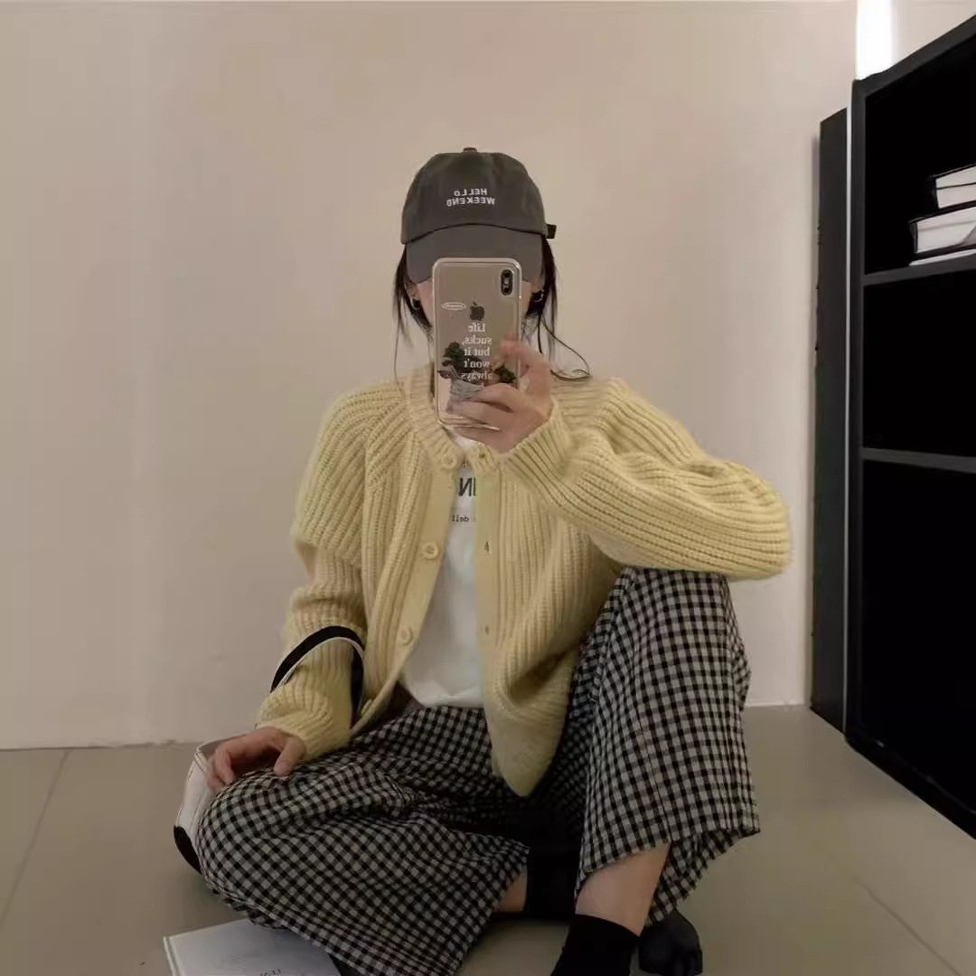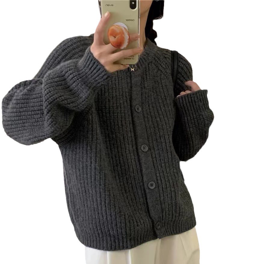 Thick needle pink knitted cardigan women's spring Korean style lazy style solid color round neck simple all-match temperament sweater coat