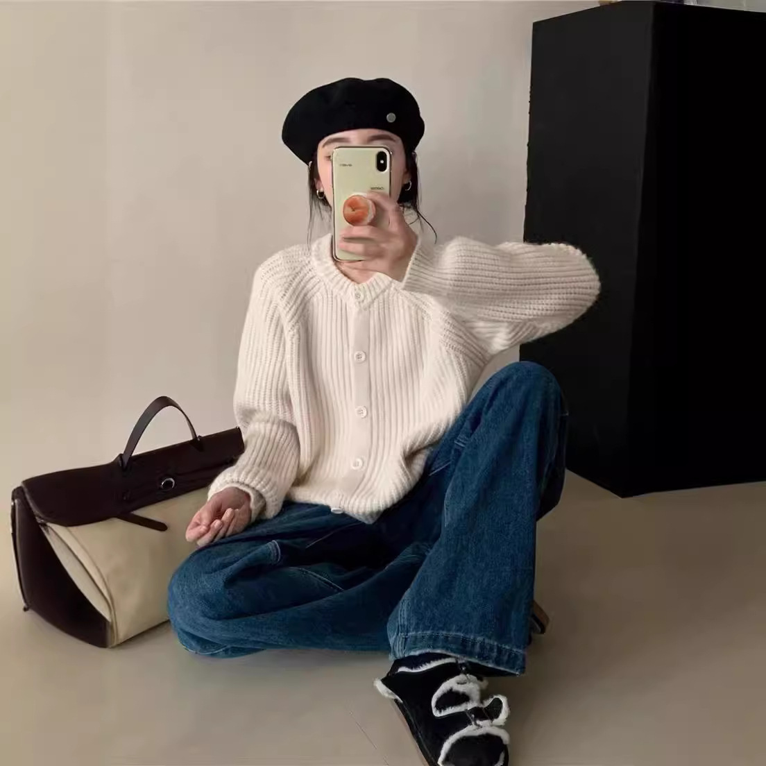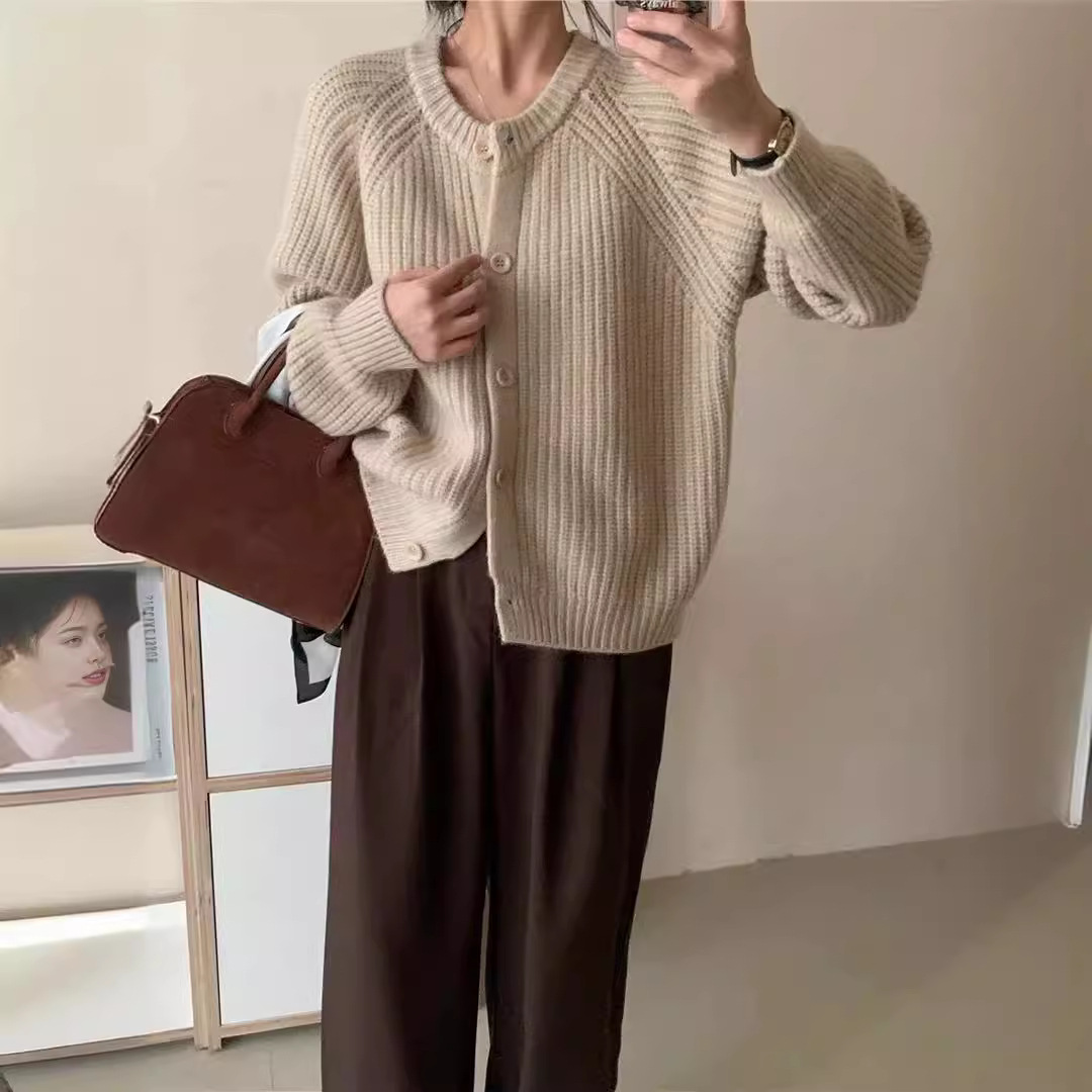 Thick needle pink knitted cardigan women’s spring Korean style lazy style solid color round neck simple all-match temperament sweater coat