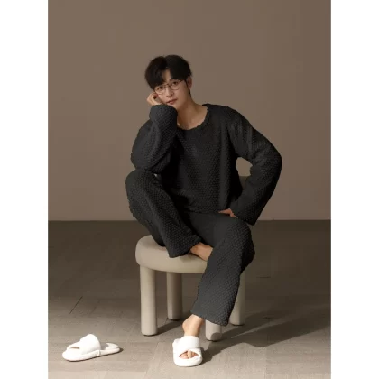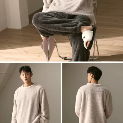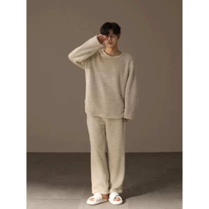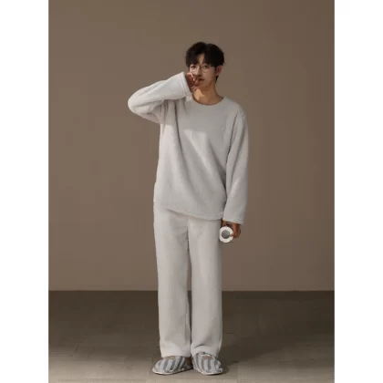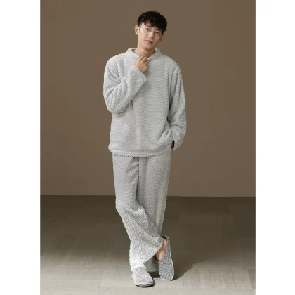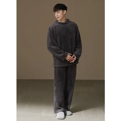 “Thicker and Velvet” keeps warm pajamas Men in autumn and winter coral velvet plush loose straight round necklasses