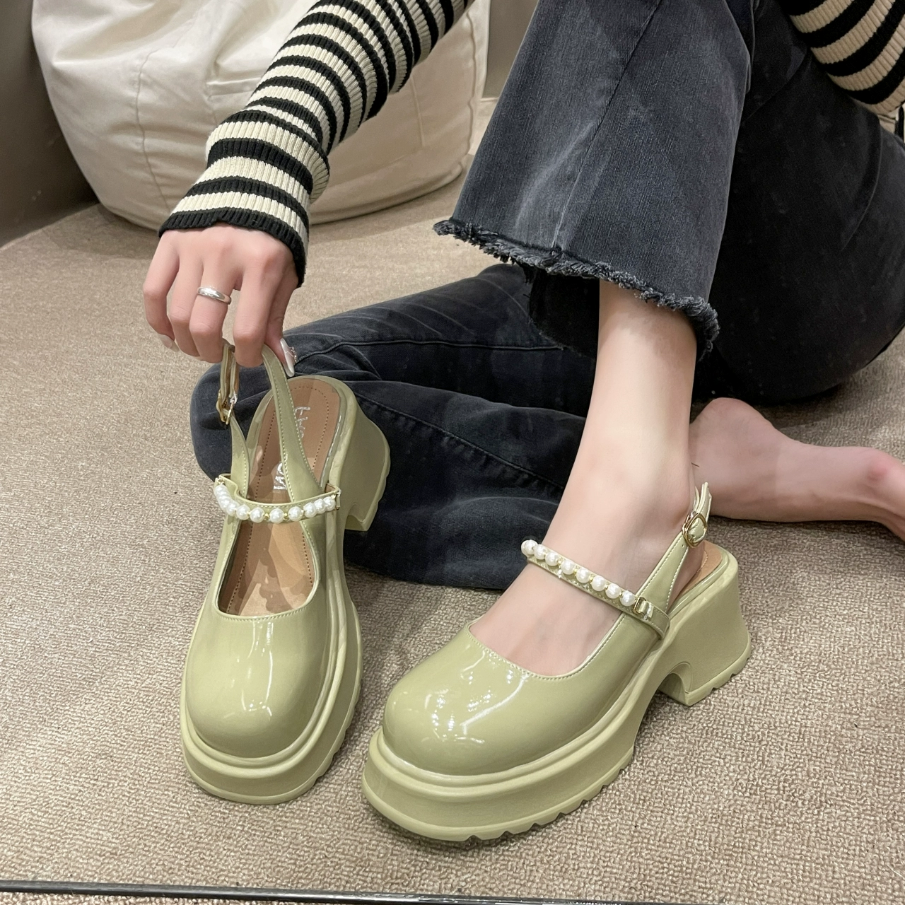 Thick-soled sandals for women 2024 summer new style thick-heeled Baotou high-heeled shoes pearl fairy style French Mary Jane shoes