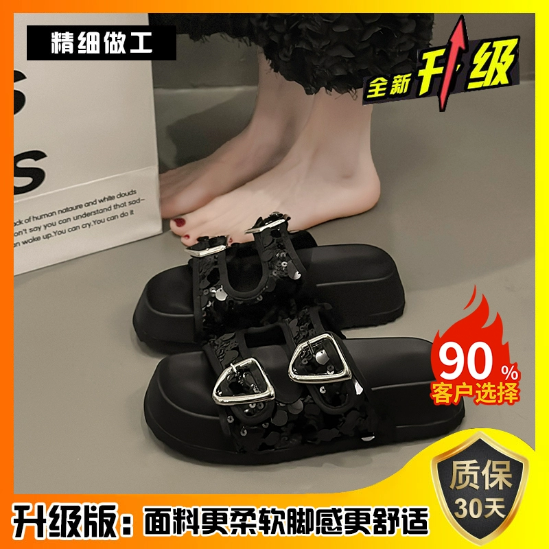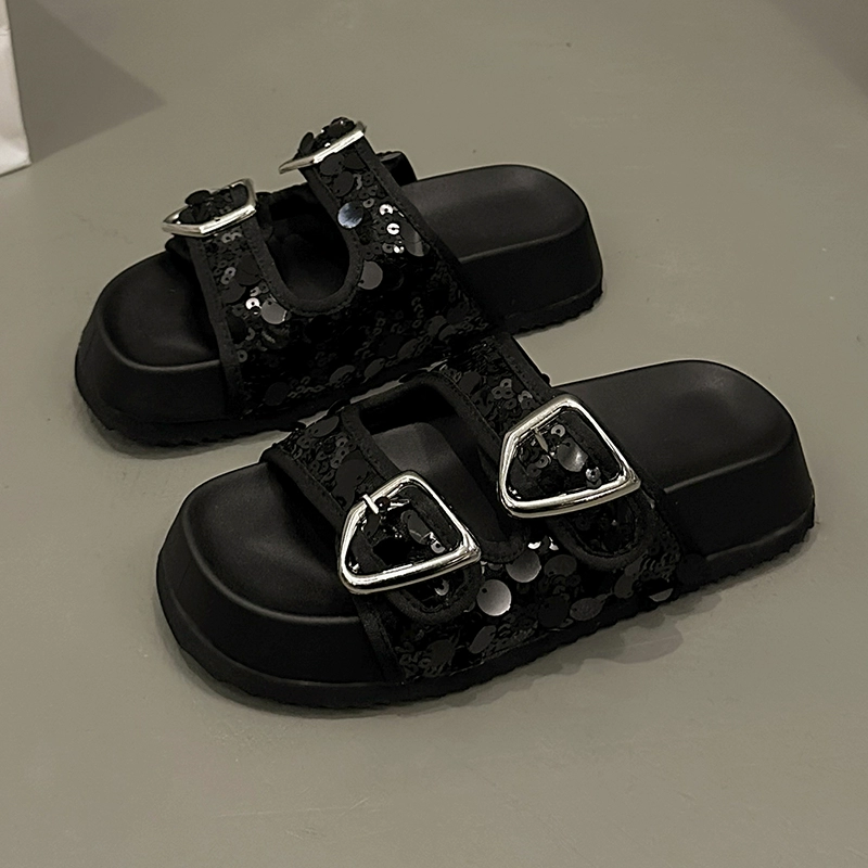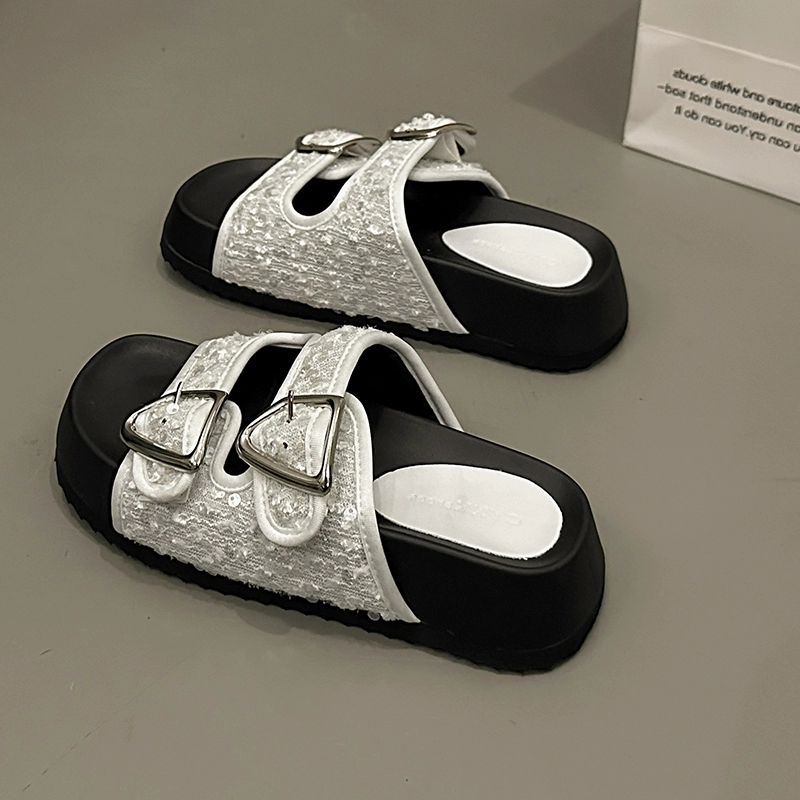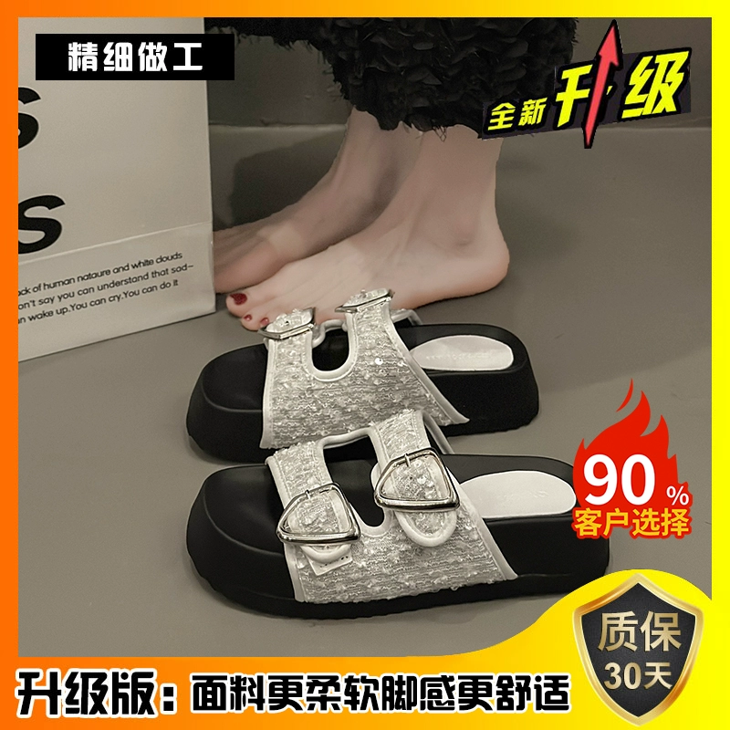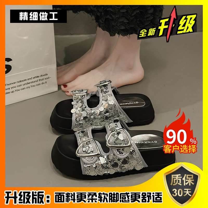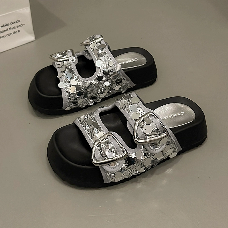 Thick-soled silver sequin women’s summer high-end fashion slippers