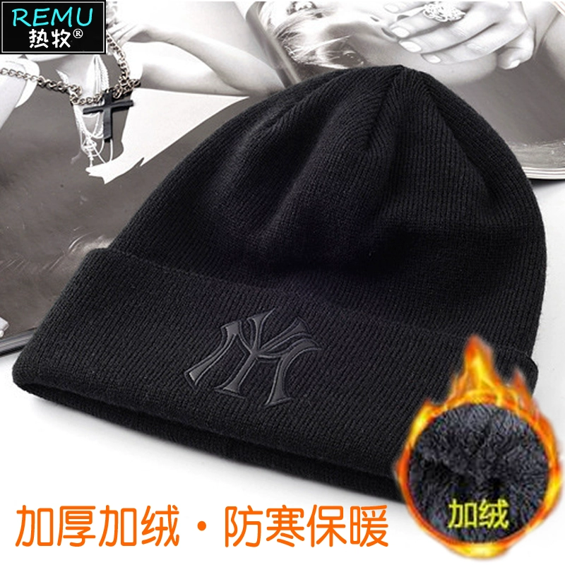 Plel of velvet thick hat Men and women knitted hats in autumn and winter in winter, ears, simple tide brand Korean wool hat black