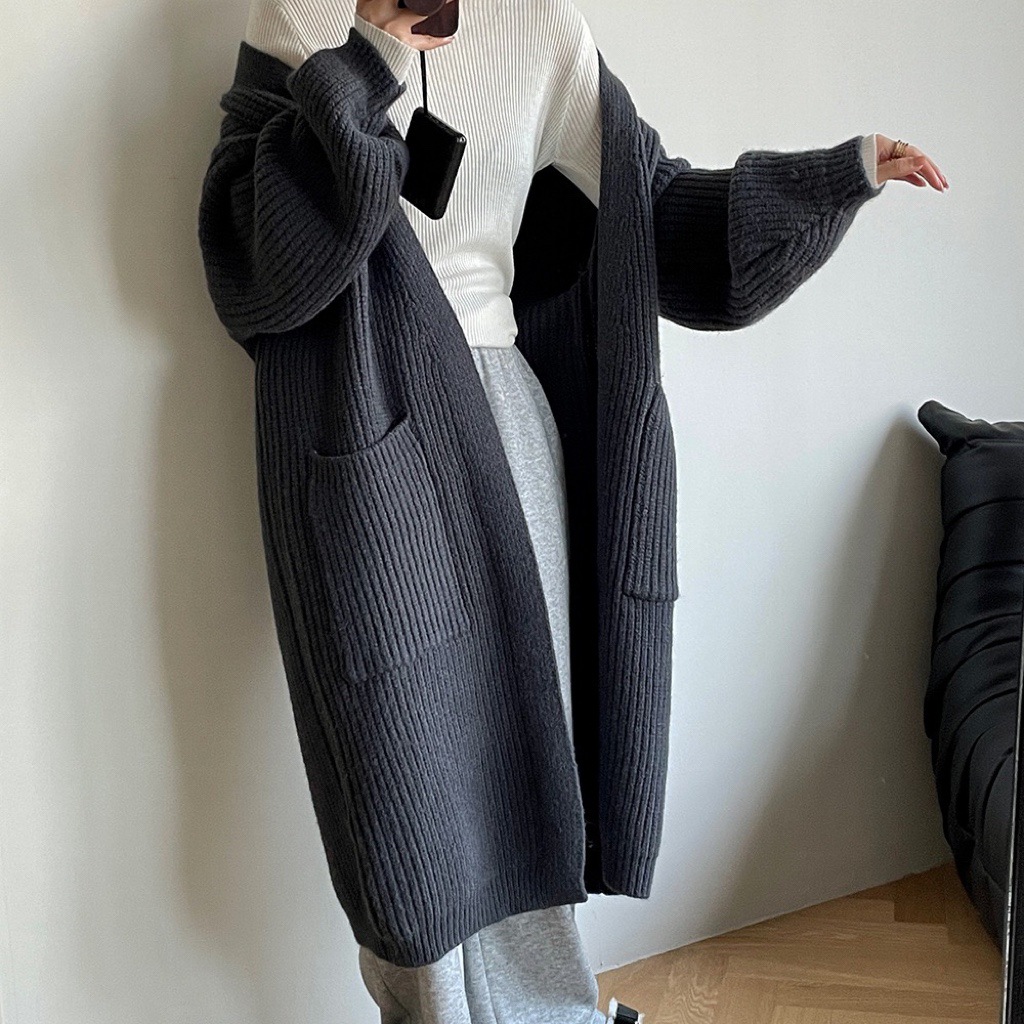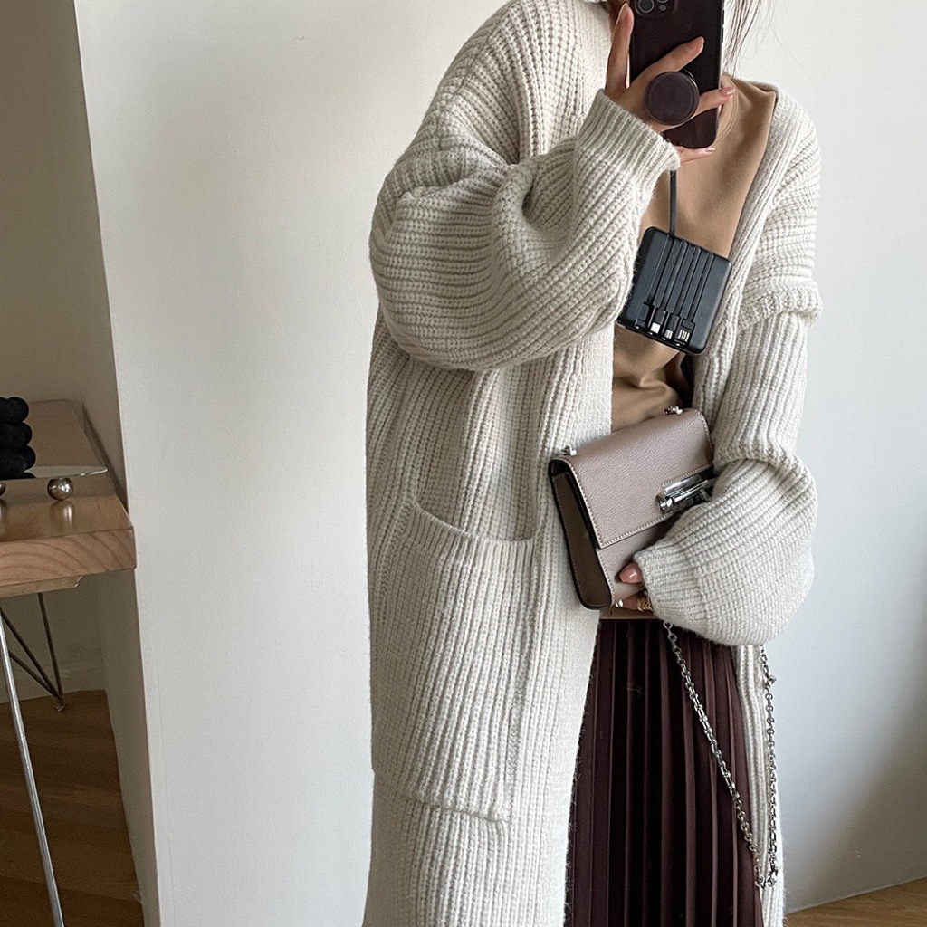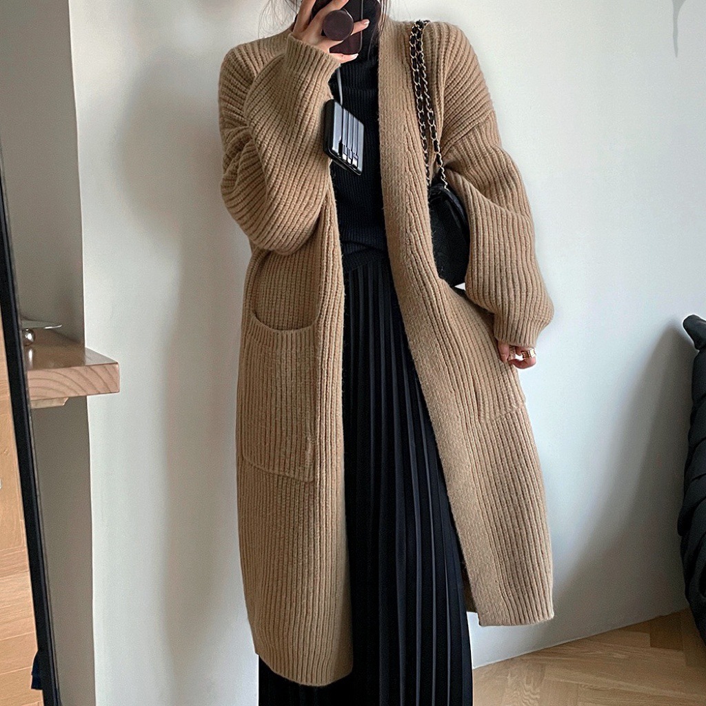 Thickened Coarse Wool Mid-length Knitted Cardigan Women’s 2022 New Lazy Wind Big Pocket Loose All-match Jacket
