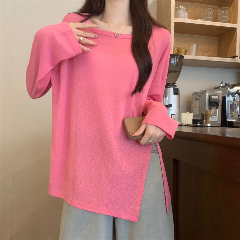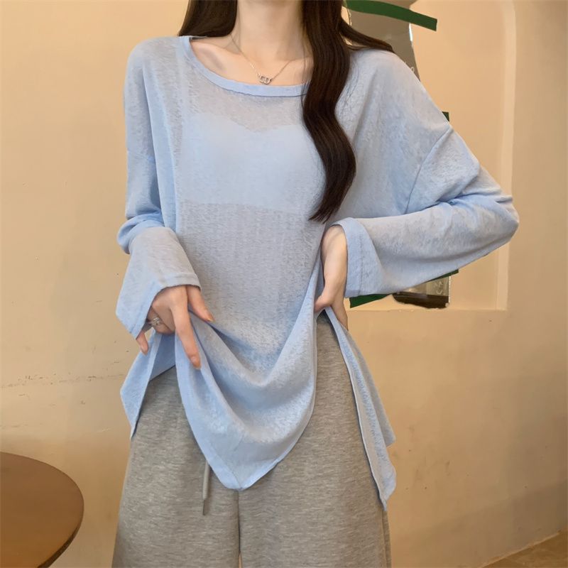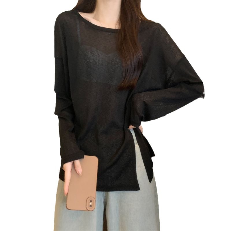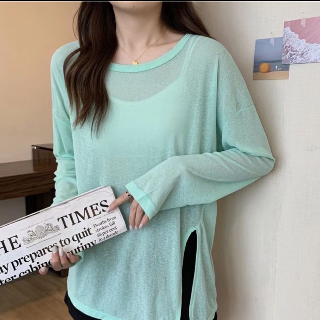 | nameOriginal | Thin micro-transparent split sunscreen long-sleeved T-shirt women's spring new design candy-colored loose air-conditioning blouse ins |