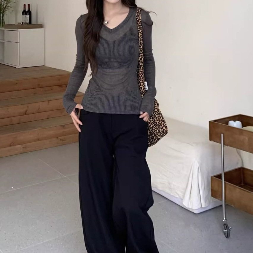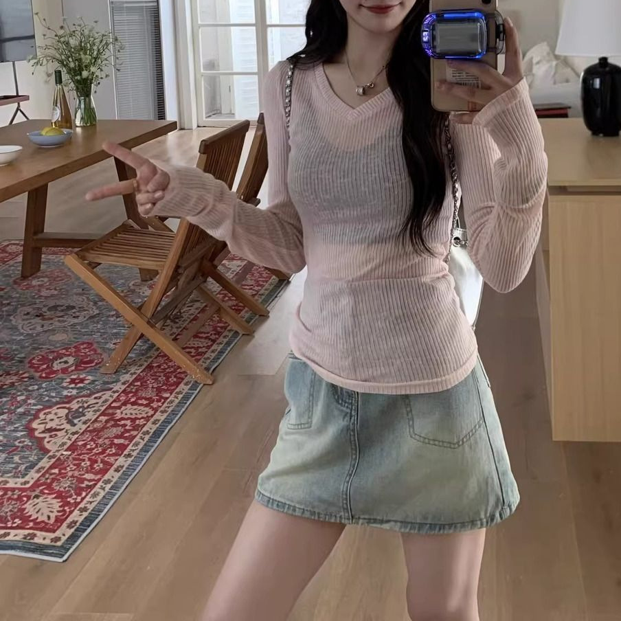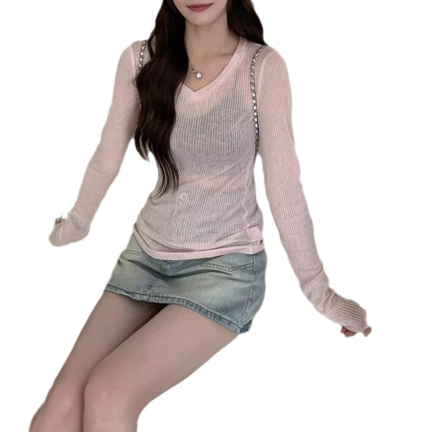 | nameOriginal | Thin micro-transparent V-neck long sleeve T-shirt 2024 spring and summer new sunscreen slim slim solid color top |