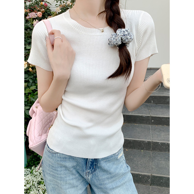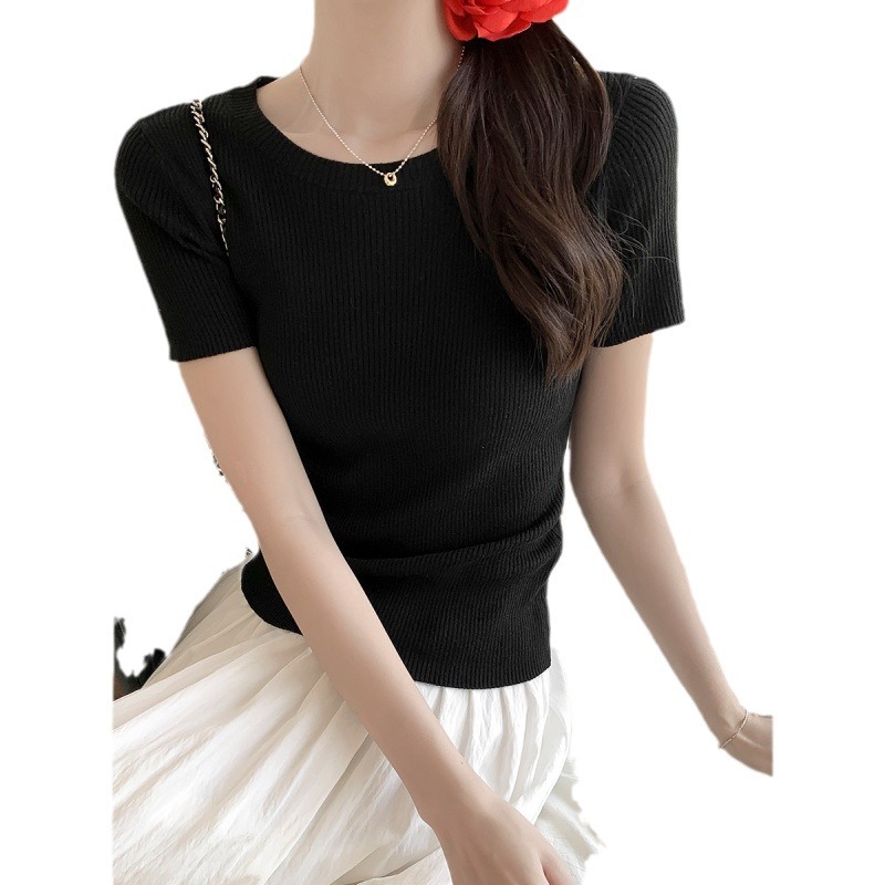 Thin Round Neck Shoulder Knitted Short-sleeved T-shirt Women's Summer 2024 New Style Dopamine Wear Slim-fit Slimming Top