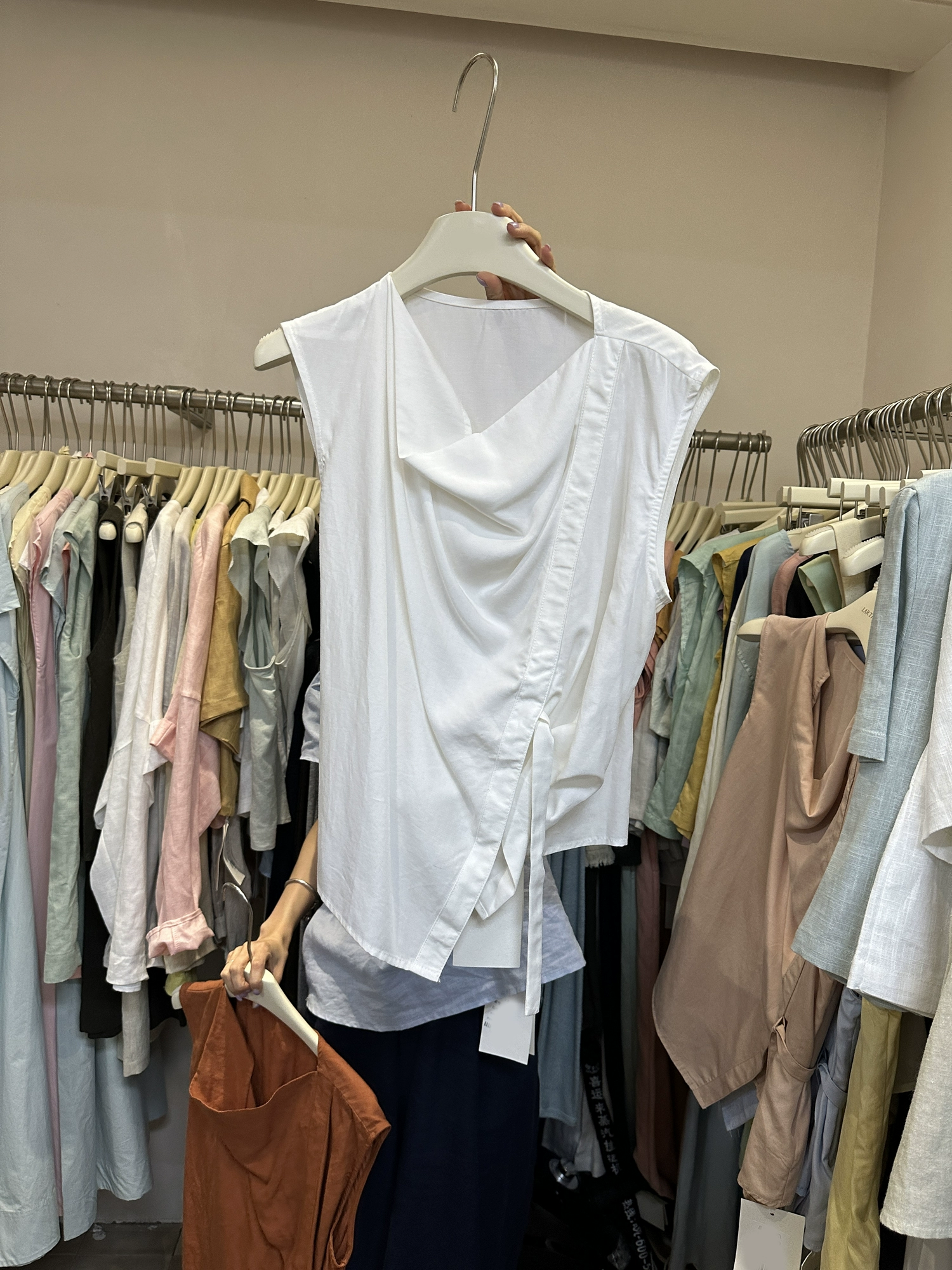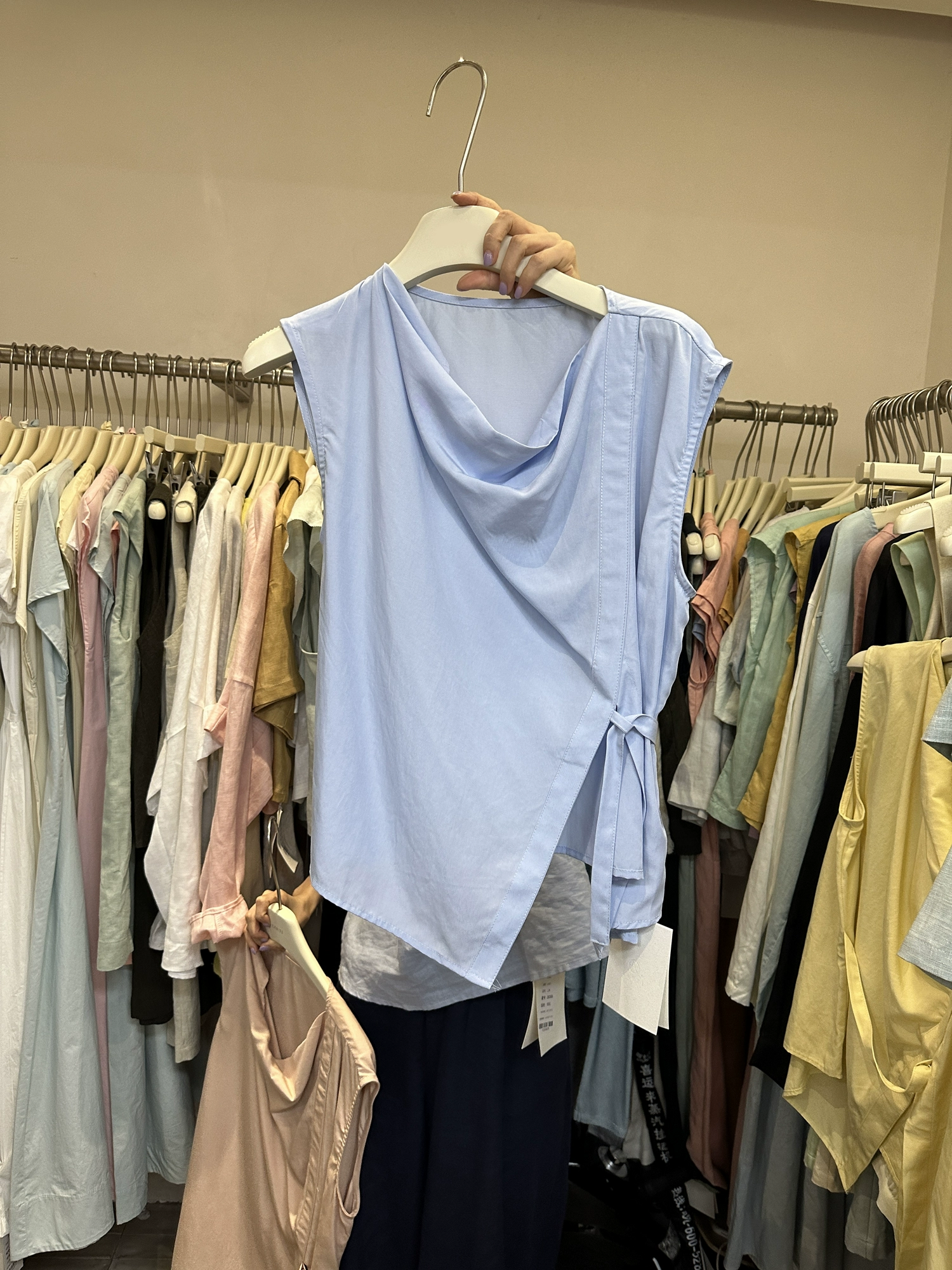 | nameOriginal | Thirteen lines of slim fit irregular stacked collar sleeveless top |