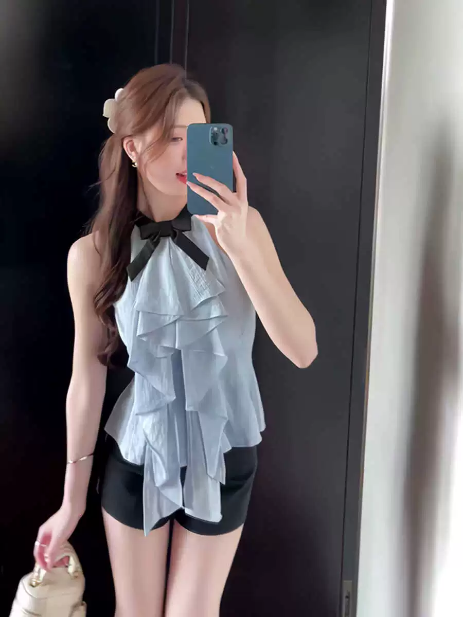 | nameOriginal | This year's popular socialite daughter-in-law style sleeveless halterneck bow-tie collar ruffled French-style gentle shirt top |