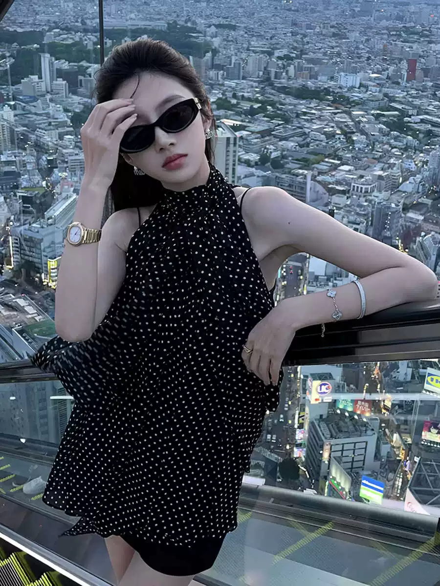 | nameOriginal | This year’s popular summer French holiday style halter neck streamer chiffon shirt top with polka dot print + inner suspender |