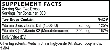 | nameOriginal | Thorne – Vitamin D + K2 Liquid with a metered Dispenser – Vitamins D3 and K2 to Support Healthy Bones and Muscles* – 1 Fl Oz (30 ml) – 600 Servings |