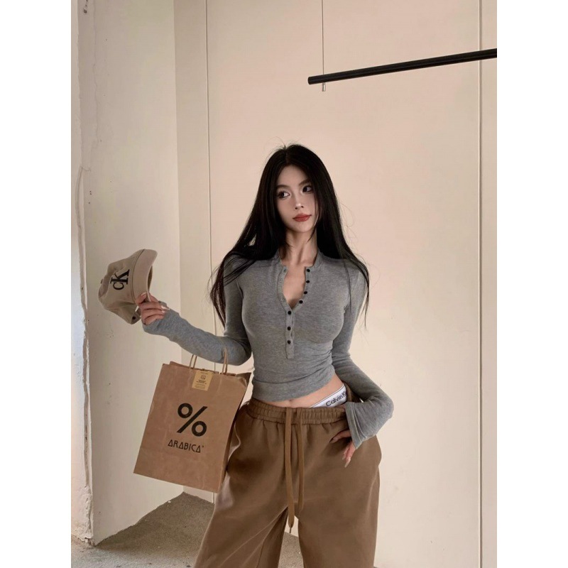 [Thread velvet] V-neck long sleeve inner base shirt women’s slim half-open buckle shoulder T-shirt top