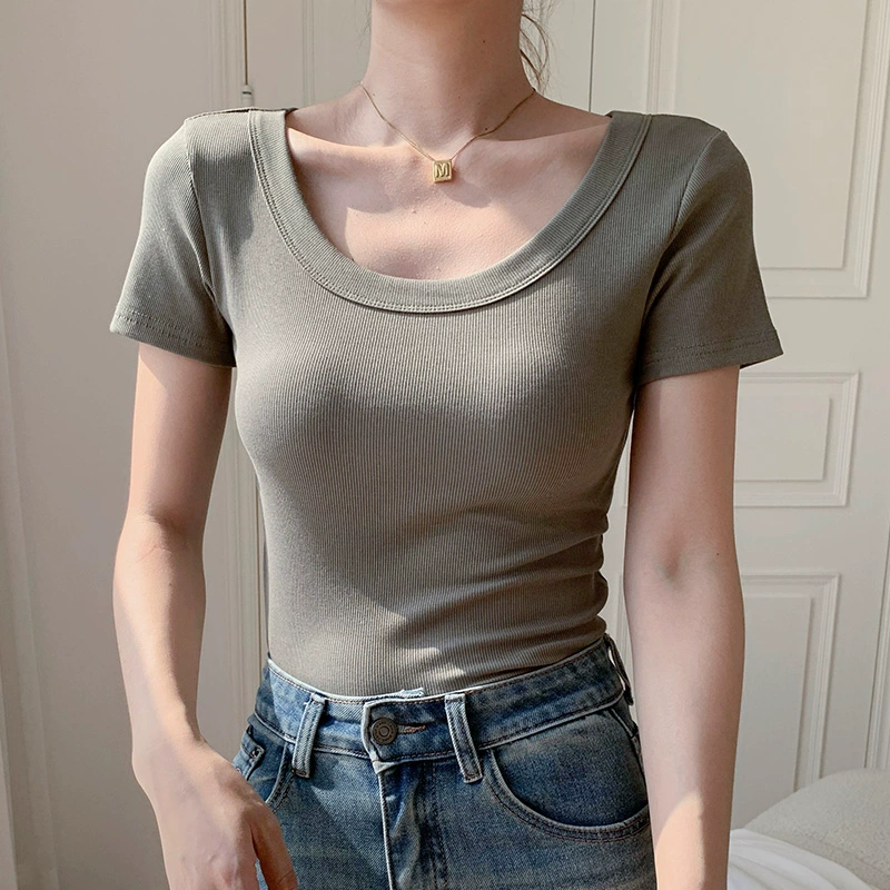 Threaded short-sleeved summer U-neck versatile thin top T-shirt