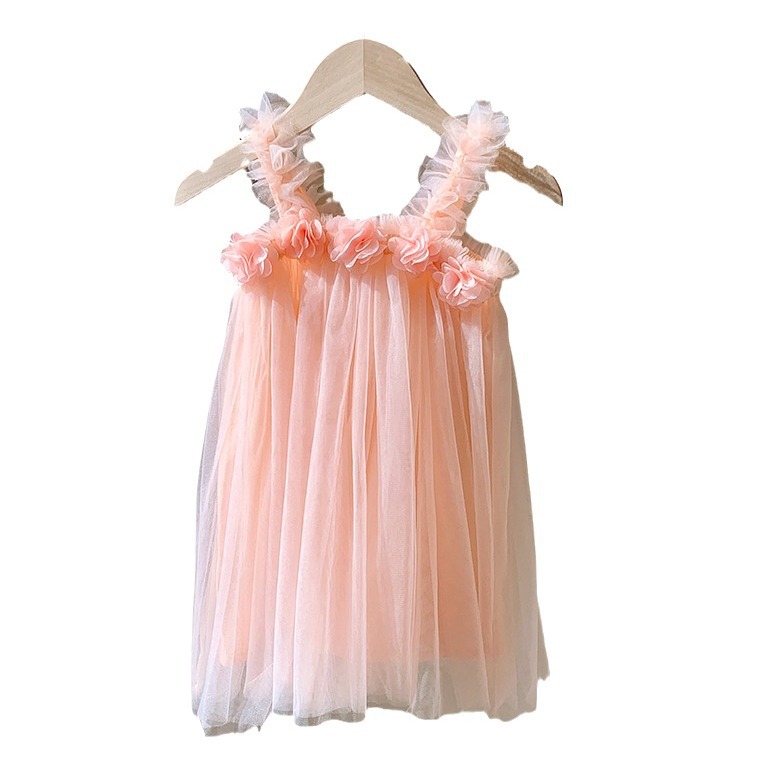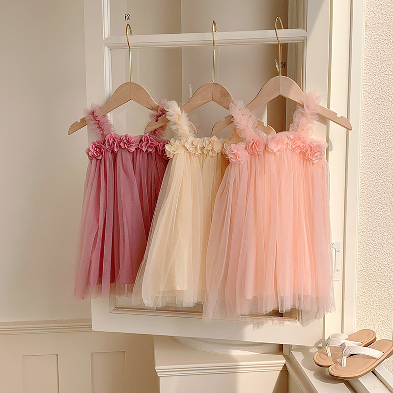 Three-dimensional Flower Sweet Girl's Mesh Dress 2024 Summer Sling Beach Dress Baby Girl Princess Dress