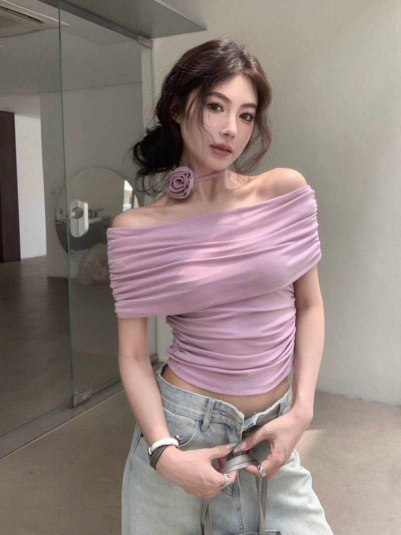 Three-dimensional sexy short-sleeved waist-hugging purple flowers