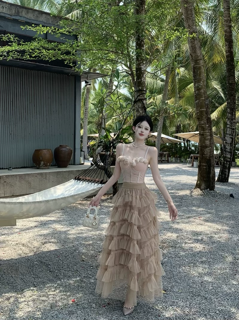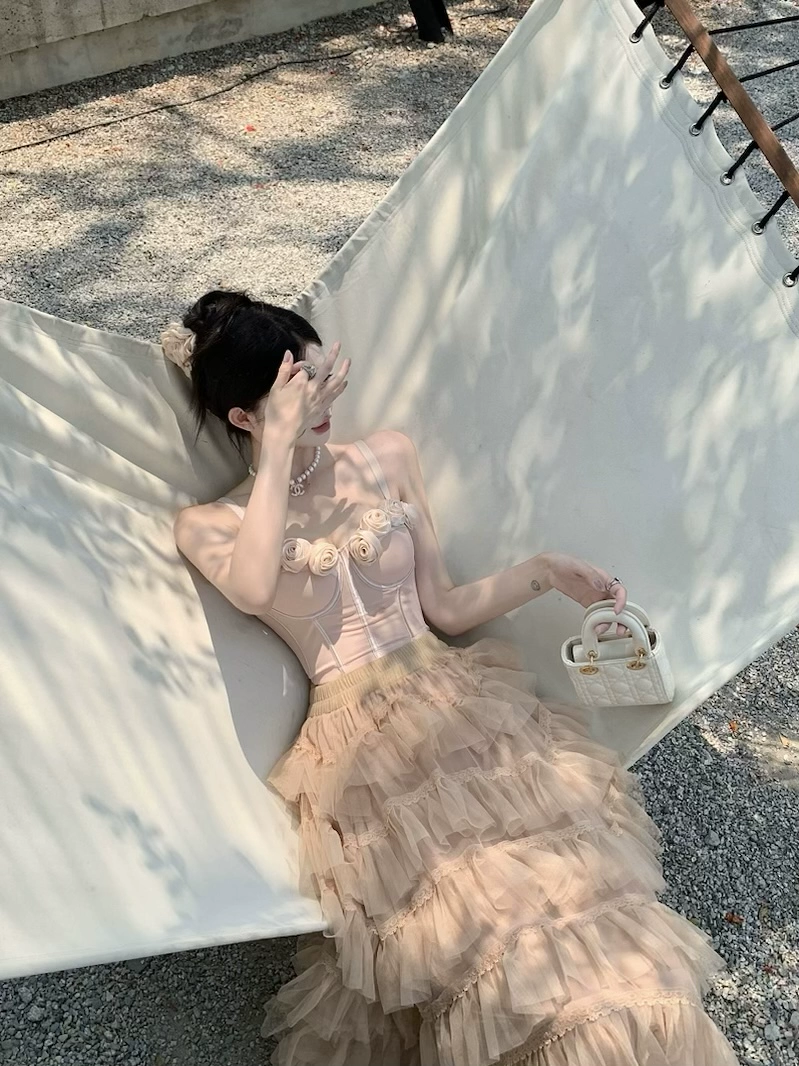 Three-dimensional sling fishbone waist pure desire sleeveless flower