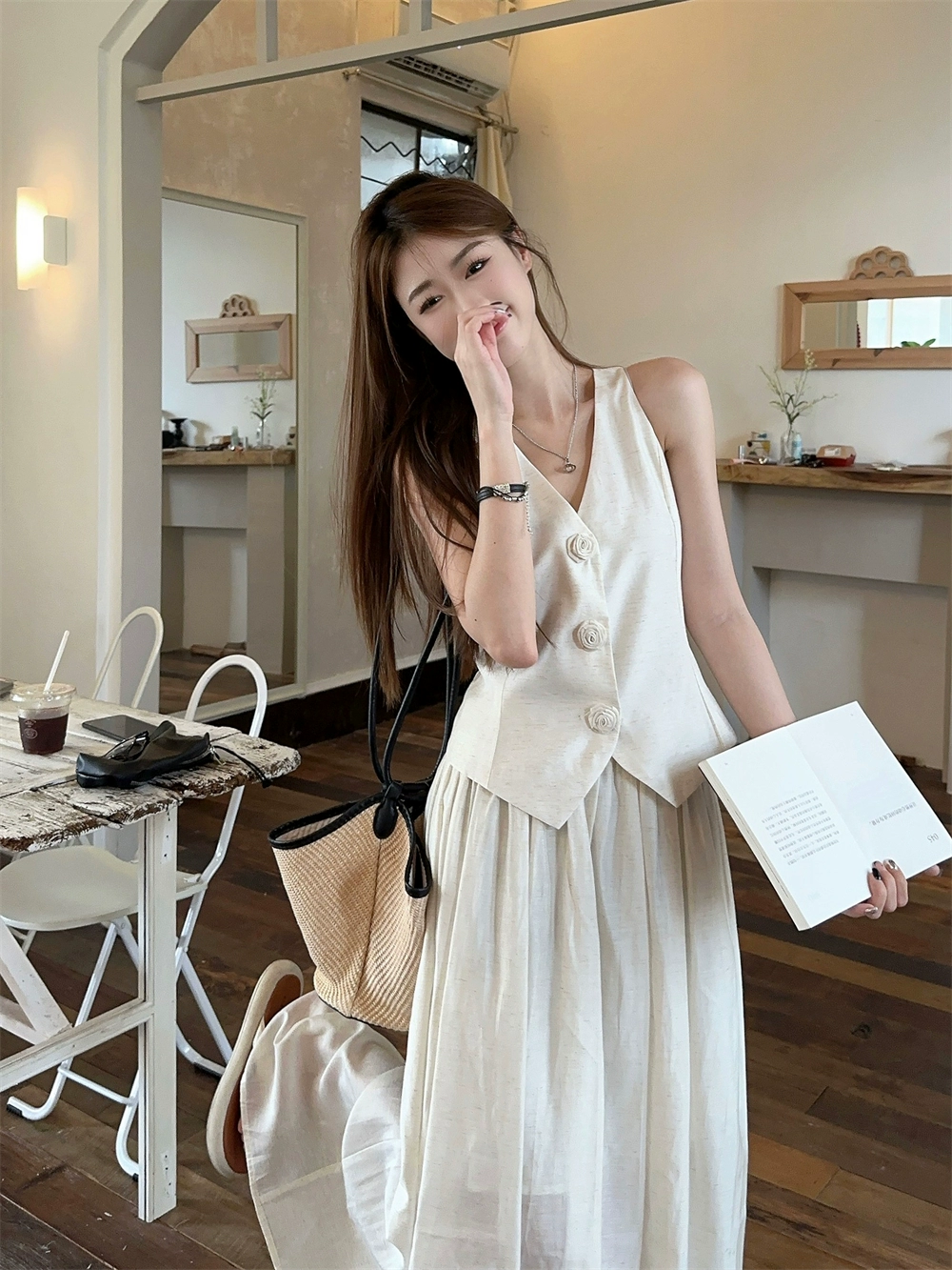| nameOriginal | Three-dimensional v-neck vest a-line long skirt two-piece flower set |