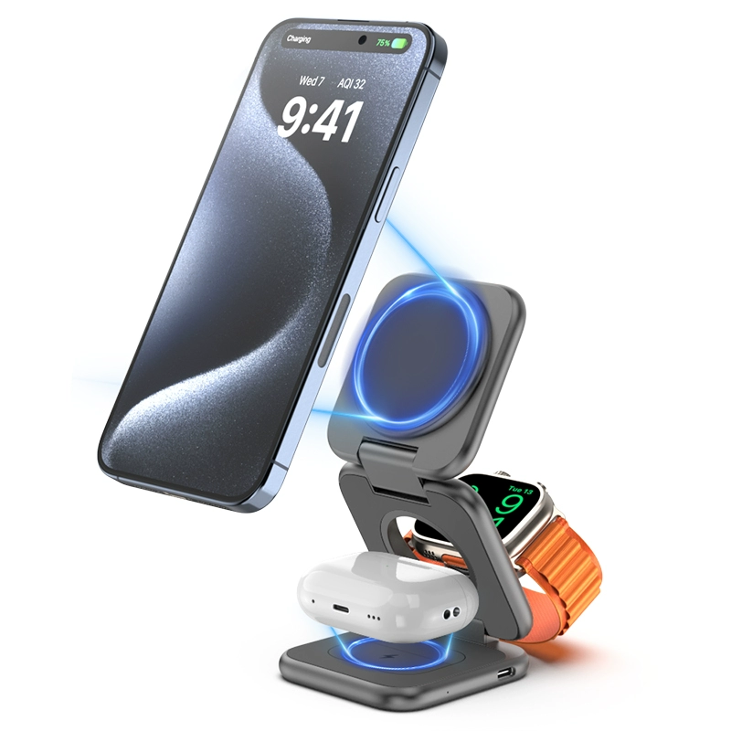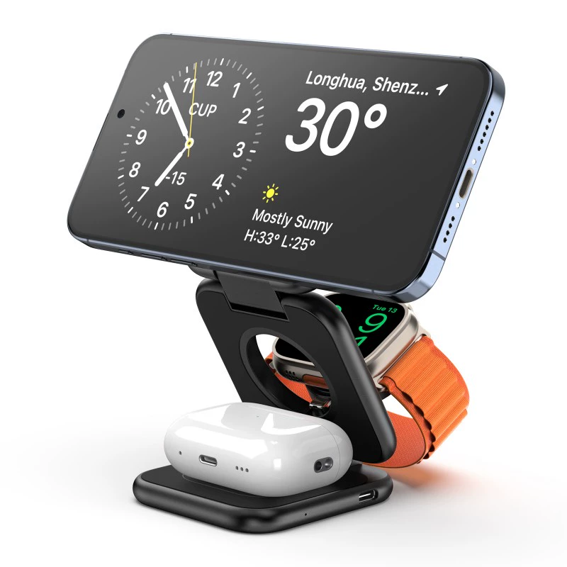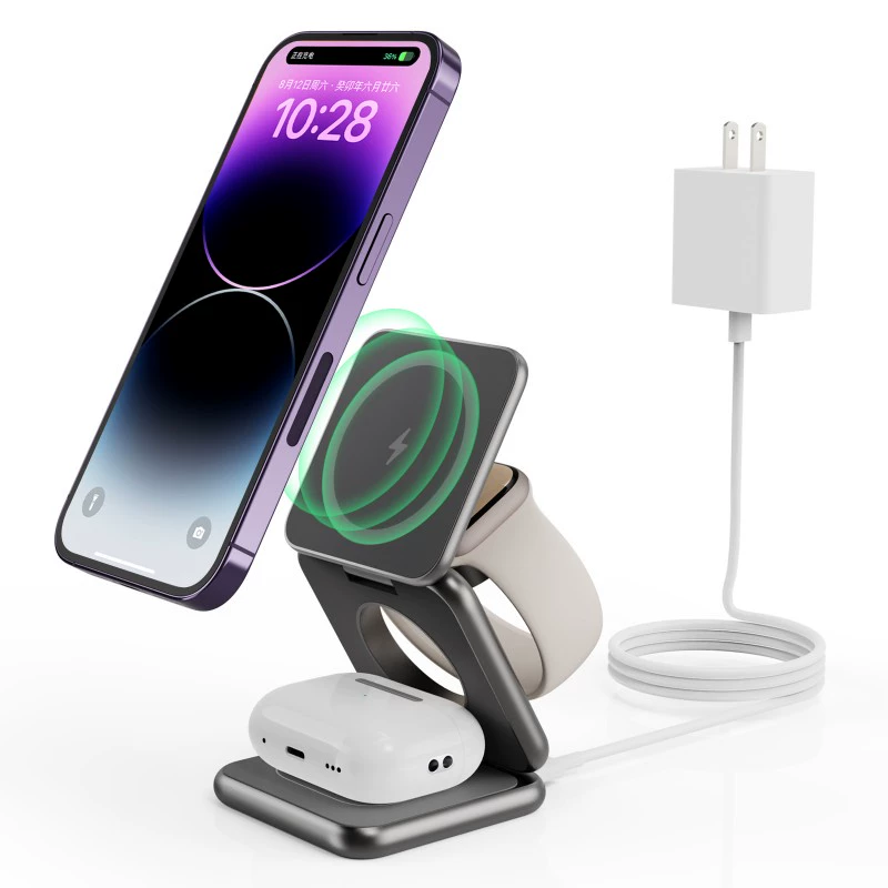 | nameOriginal | Three-in-one wireless charger folding magnetic stand suitable for Apple 14/15 mobile phones, Airpods, earphones and watches |