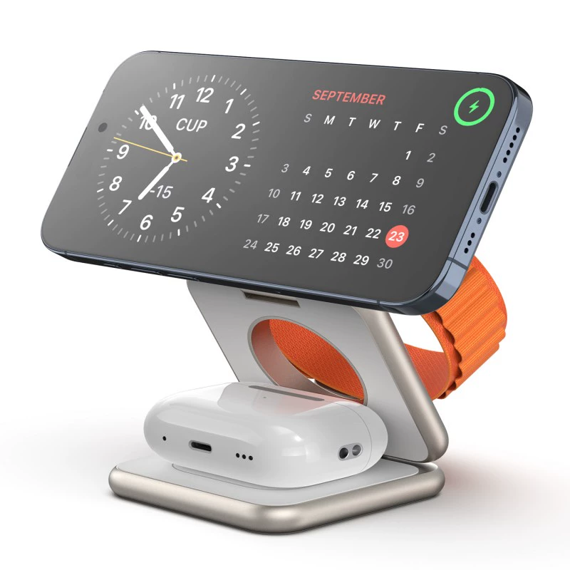 | nameOriginal | Three-in-one wireless charger folding magnetic stand suitable for Apple 14/15 mobile phones, Airpods, earphones and watches |