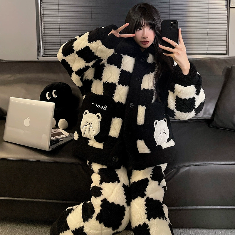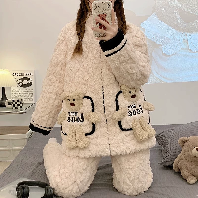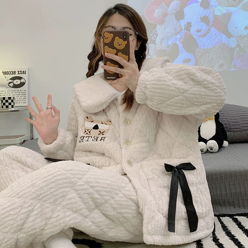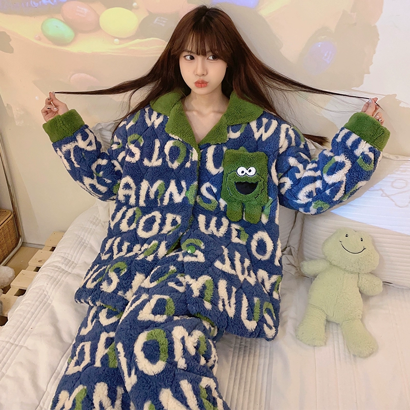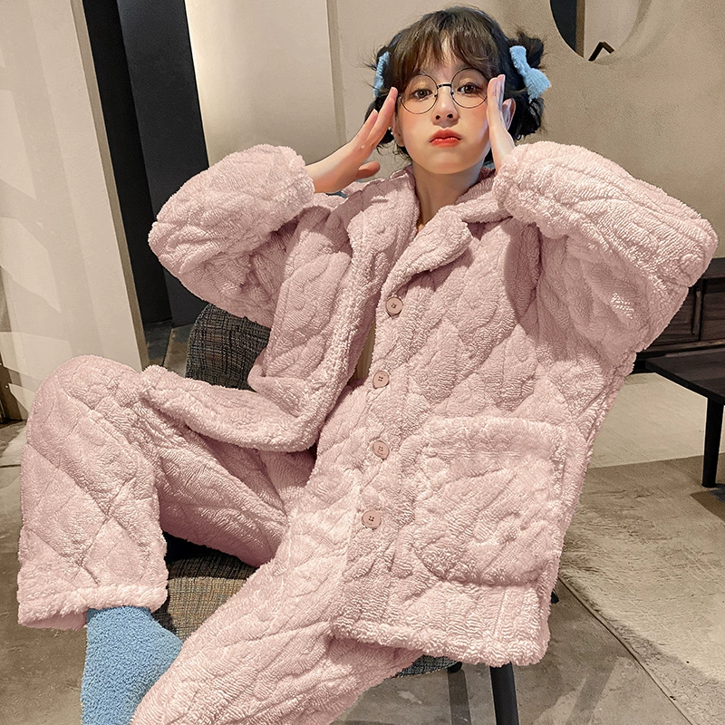 Three-layer quilted pajamas for women in winter plus velvet and thickened coral velvet flannel winter warm home clothes that can be worn outside
