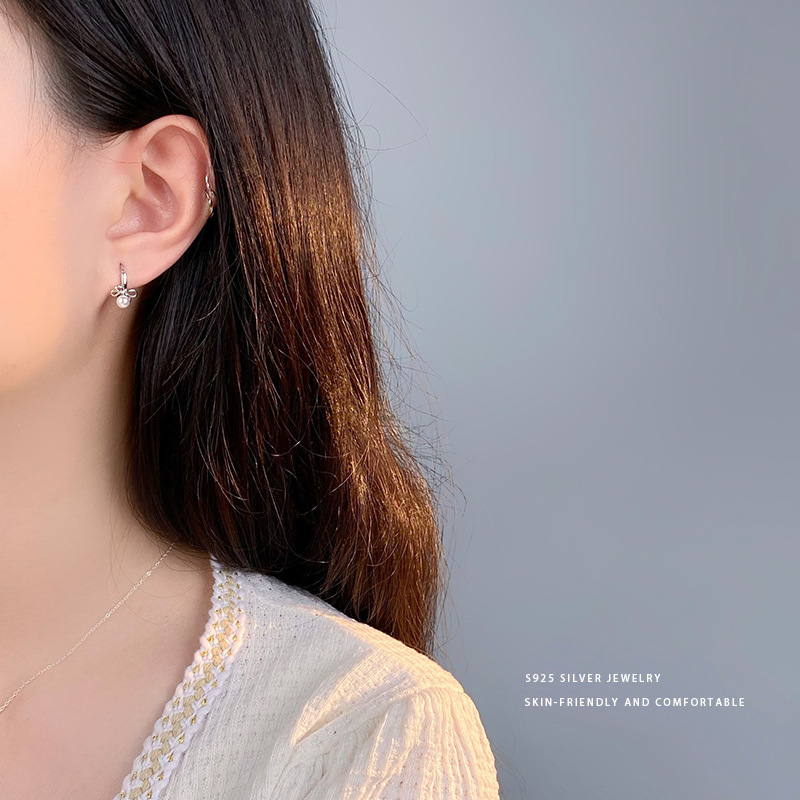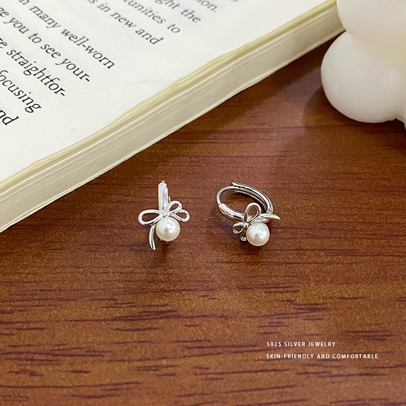 Tianyin S925 Sterling Silver Fashion Sweet Bow Pearl Ear Buckle All-match Ins Design Sense Ear Ring Ear Jewelry