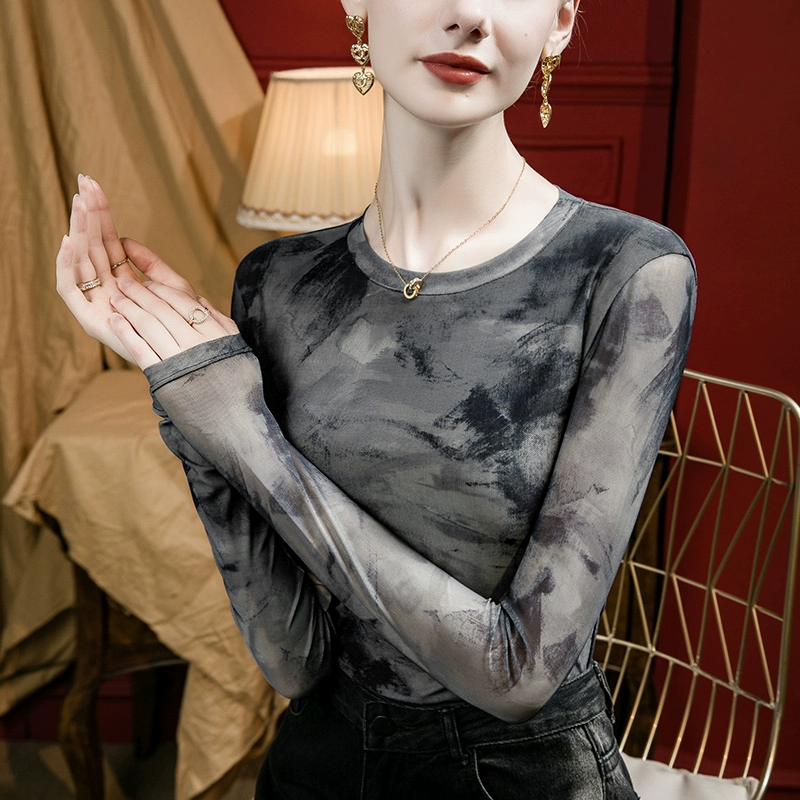 Dyeing printing retro slim -fitting autumn T -shirt net yarn