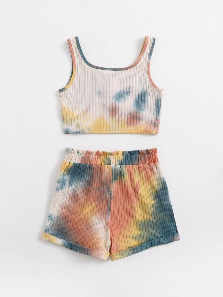 SHEIN Girls Tie Dye Tank Top And Paperbag Waist Shorts Set