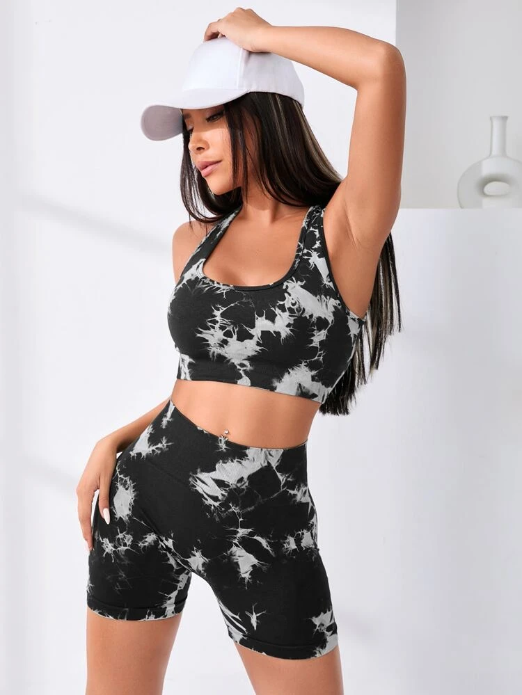| nameOriginal | SHEIN Leisure 2pcs Seamless Tie Dye Fitness Yoga Suit Gym Outfits Set Criss Cross Back Top Scrunch Butt Shorts |