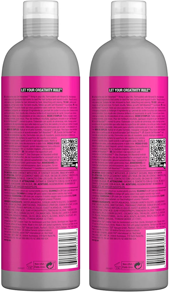 | descriptionOriginal | Description Moisturize, condition and have sweet, citrus-berry smelling strands with Self Absorbed™ Shampoo and Conditioner. This hair care formula for dry hair contains Almond Oil and a blend of moisturizing and conditioning agents that works to visibly repair hair on the outside while strengthening it from within. Our Self Absorbed™ Shampoo contains glycerin, our hero moisturizing ingredient that penetrates hair fibers to condition it from within, while our Self Absorbed™ Conditioner contains an anti-static agent that conditions and protects hair from frizz and flyaways. The Self Absorbed™ system is a hair treatment specially designed for those with hair stressed by heat, bleaching and coloring. How to use: Lather up and massage hair shampoo into wet hair and rinse. Follow with applying a generous amount of conditioner from mid-lengths to ends and rinse. For extra smoothness and shine, follow up with After Party™. Bed Head was established in the ‘90s as the original rebel hair brand, challenging the aesthetic of hairdressing at the time. With a passion for creative experimentation and fearless self-expression, we turned the world of styling products on its head, making TIGI famous for breakthrough, powerful technology and iconic packaging. Now, Bed Head has given a refresh to its iconic product range while keeping our creative and professional ethos. We have crafted new haircare products with the TIGI Creative Team, designed to be used by professional hair stylists and consumers alike, delivering phenomenal results in the salon and at home. |