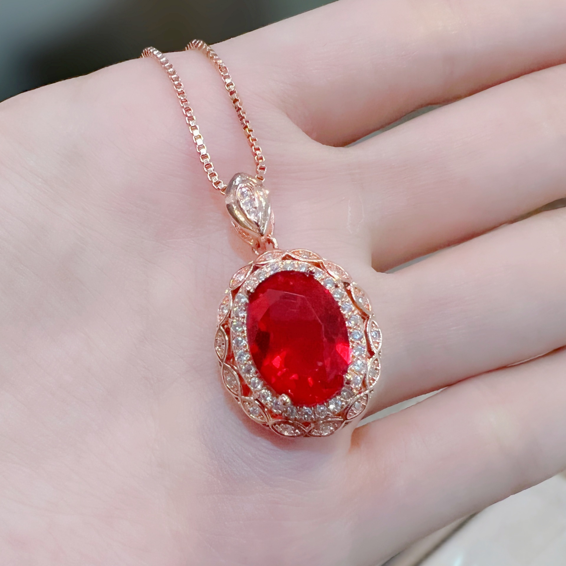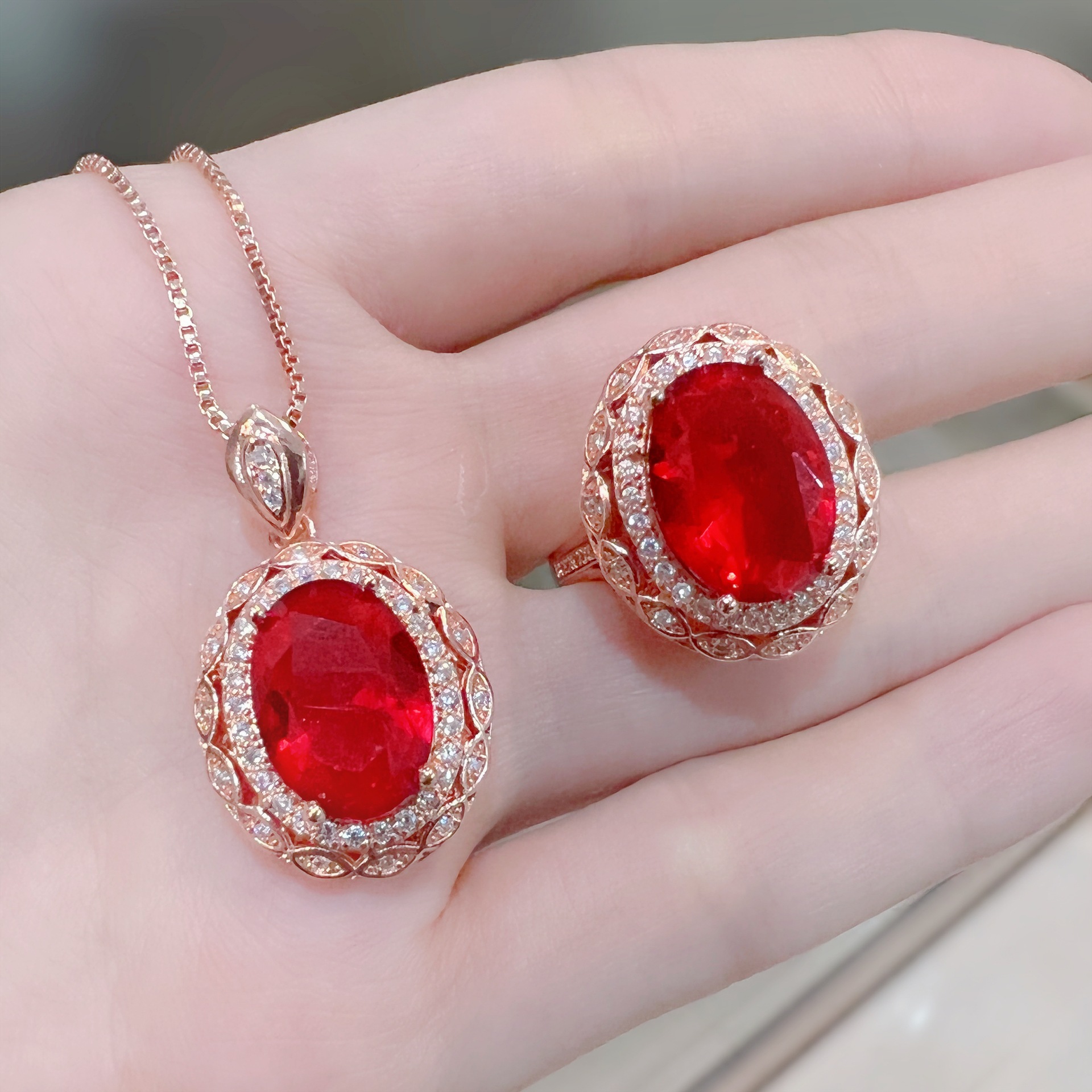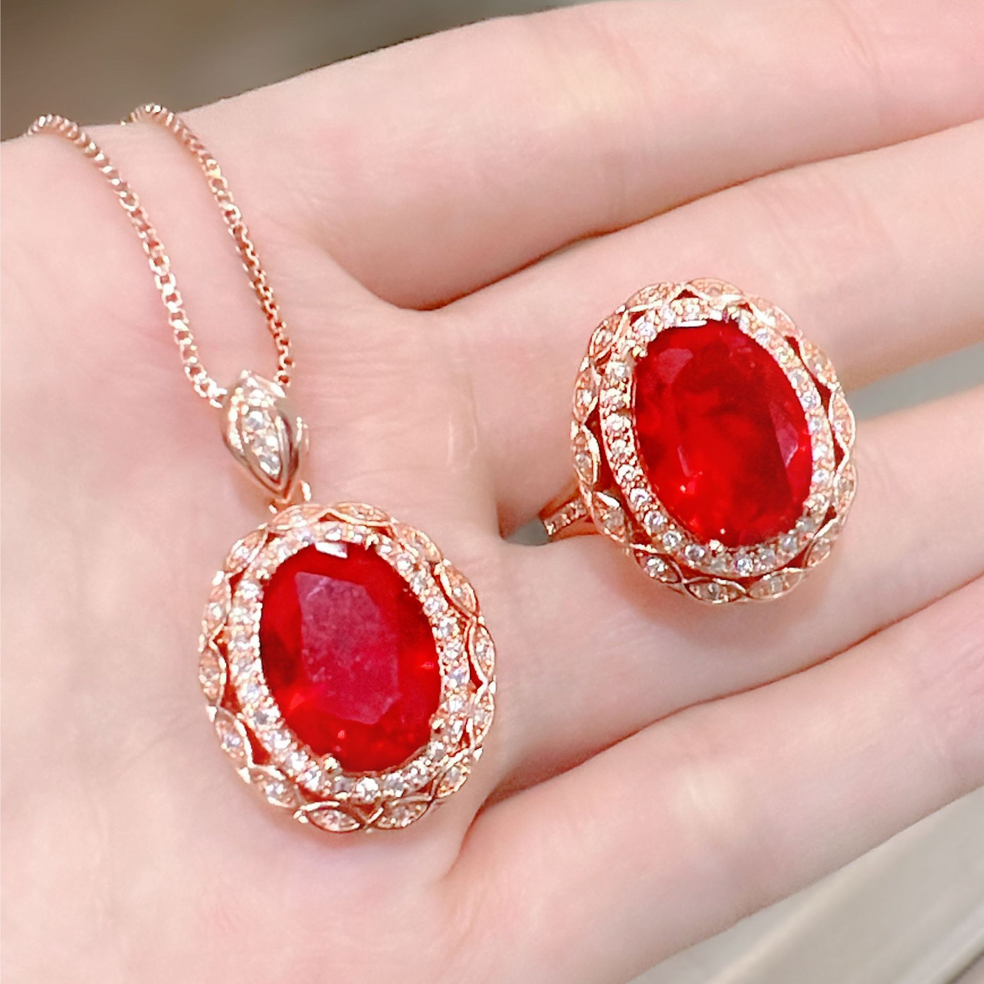 | nameOriginal | TikTok Live Luxury Princess Red Diamond Ring Pendant Necklace Pigeon Blood Red Tourmaline Color Treasure Flower Jewelry Set |