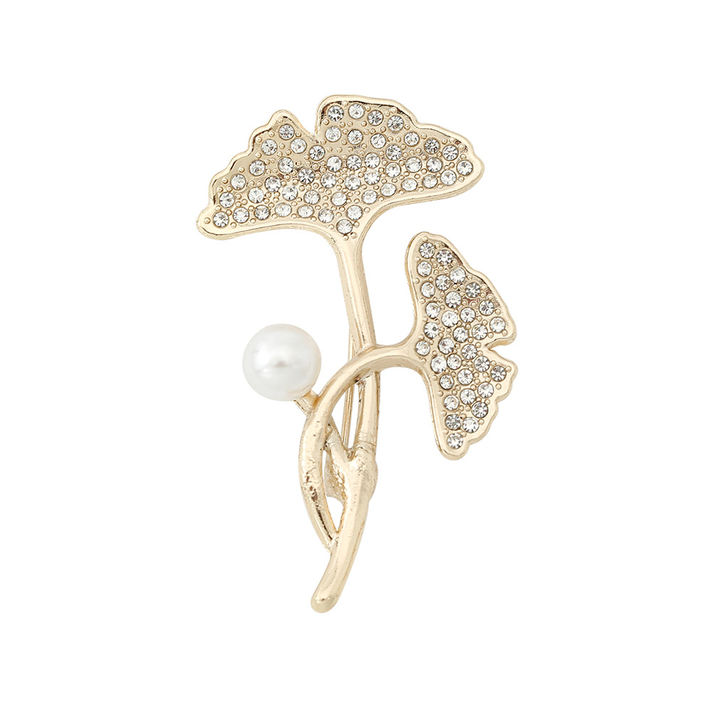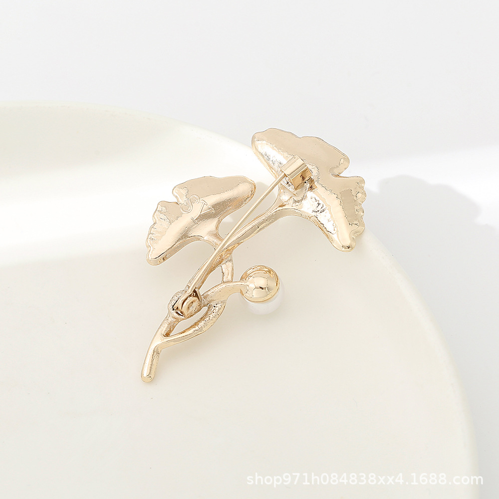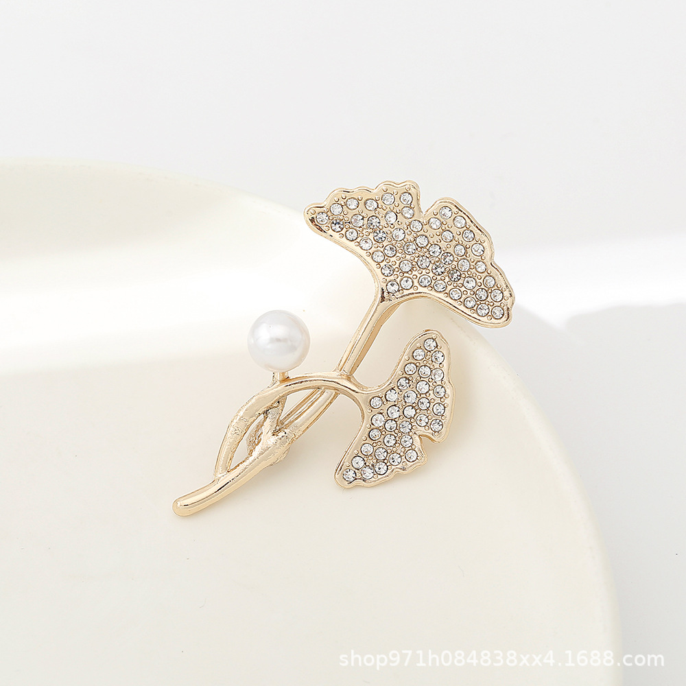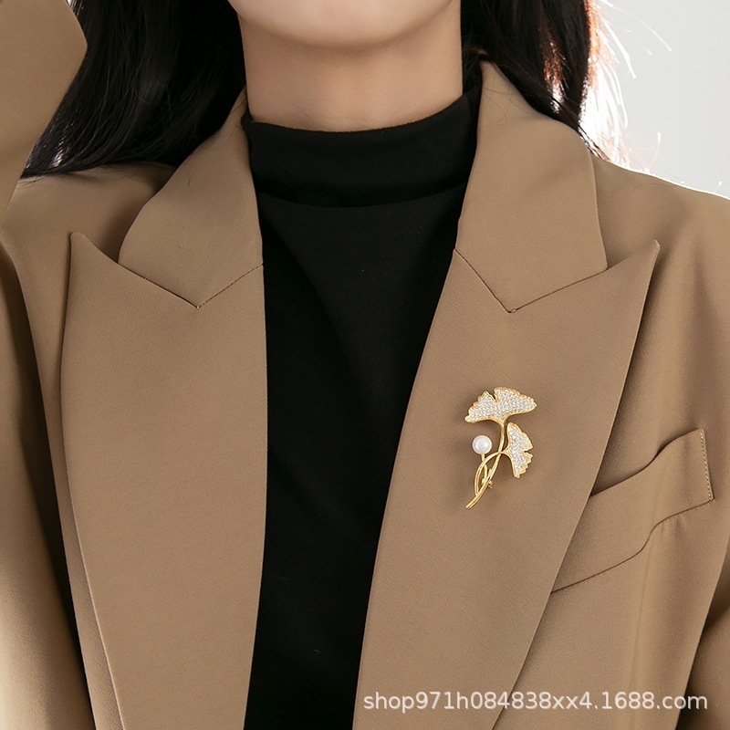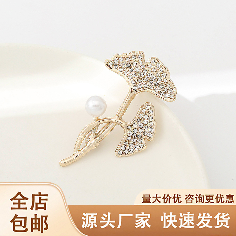 Tiktok popular fashion brooch ginkgo leaf Pearl micro-inlaid full diamond pin suit jacket corsage autumn and winter clothing jewelry