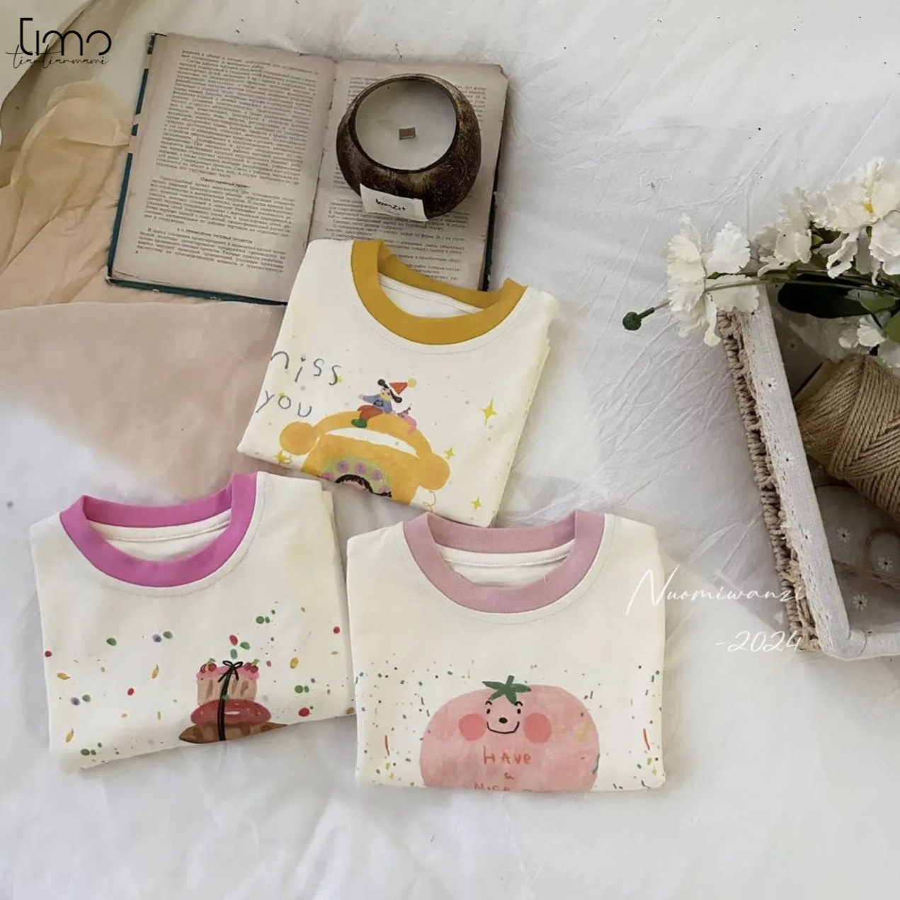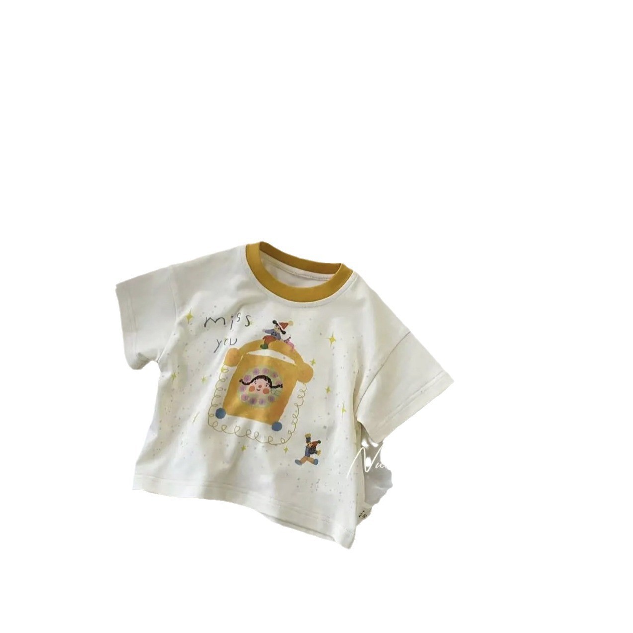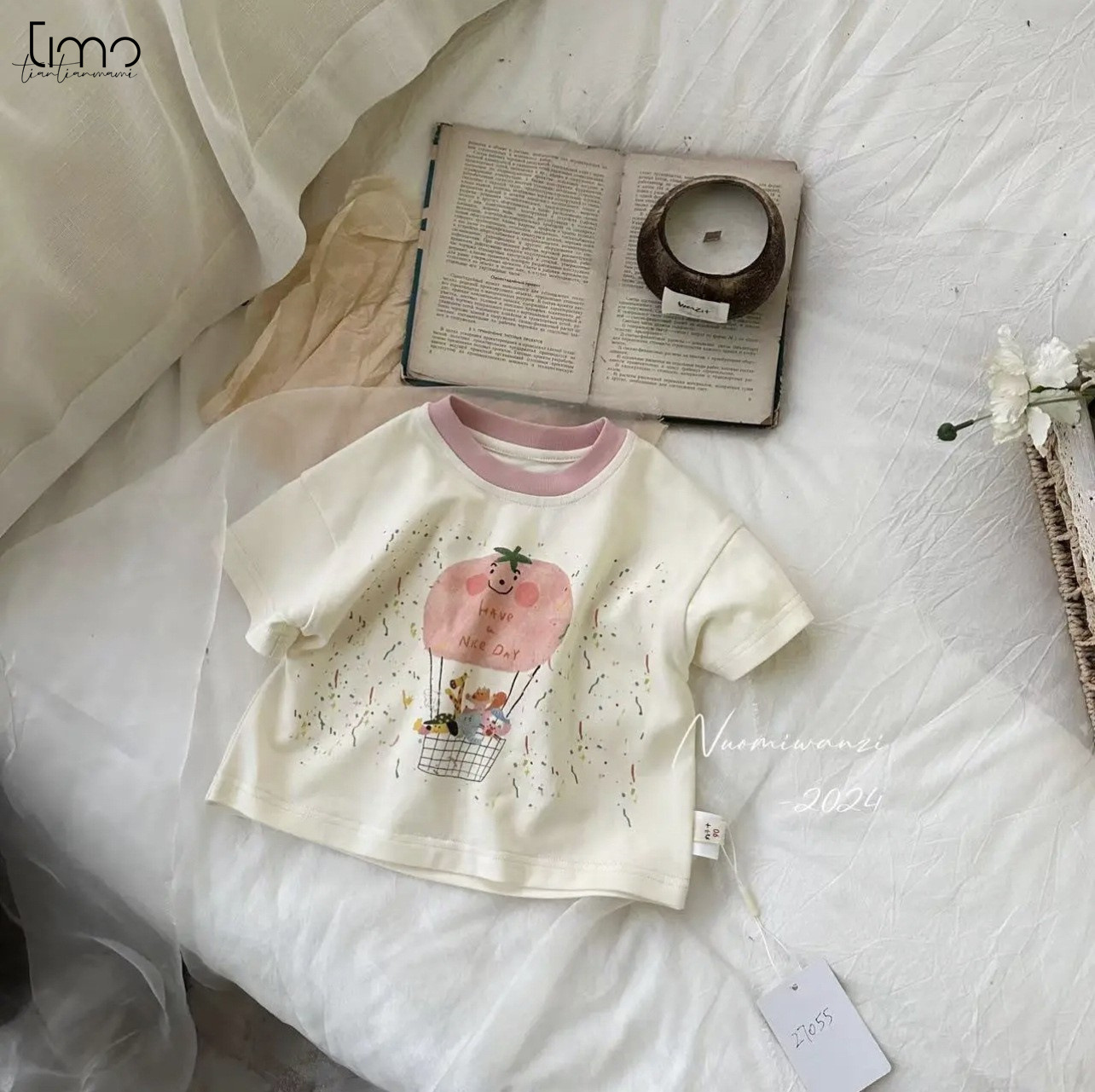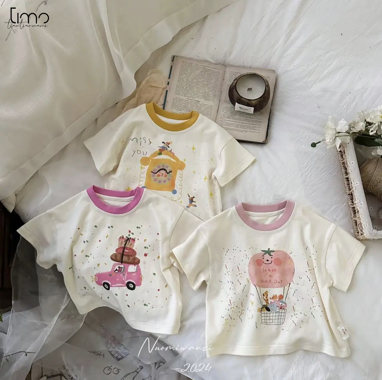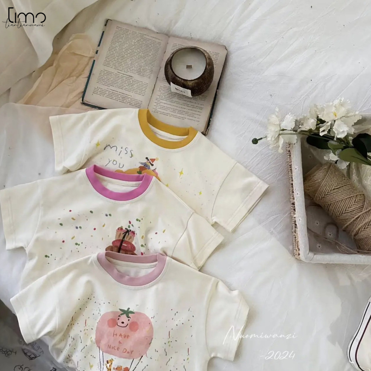 TIMO Korean Children’s Wear Girls Pink T-Shirt Summer Western Style Cartoon Pullover Children’s All-match Cute Flying Sleeve T