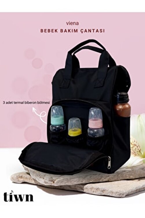 Viena Anne Baby Care Bag -4 material pockets in main compartment and spacious inner chamber -3 thermal bottle eyes in front compartment (keeps cold & warm up to 2-4 hours.) -There is a bottle and drinker's eye on the right and left sides of the bag. -Wipeable fabric (no washing.) -Production place: Turkey
