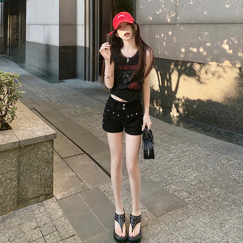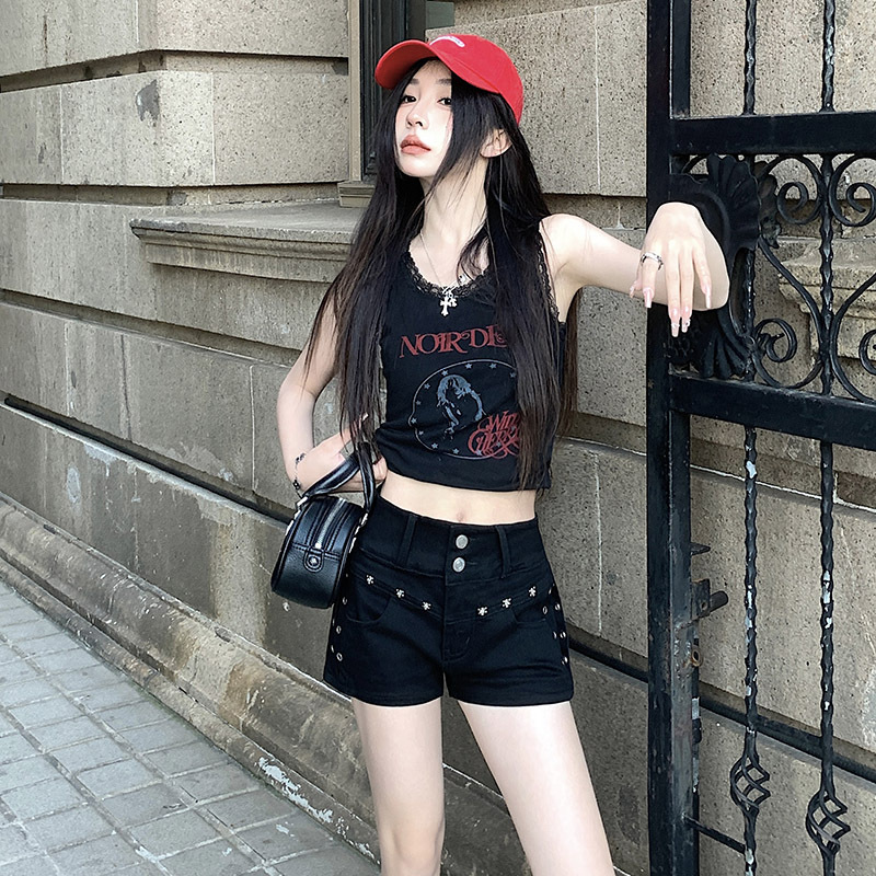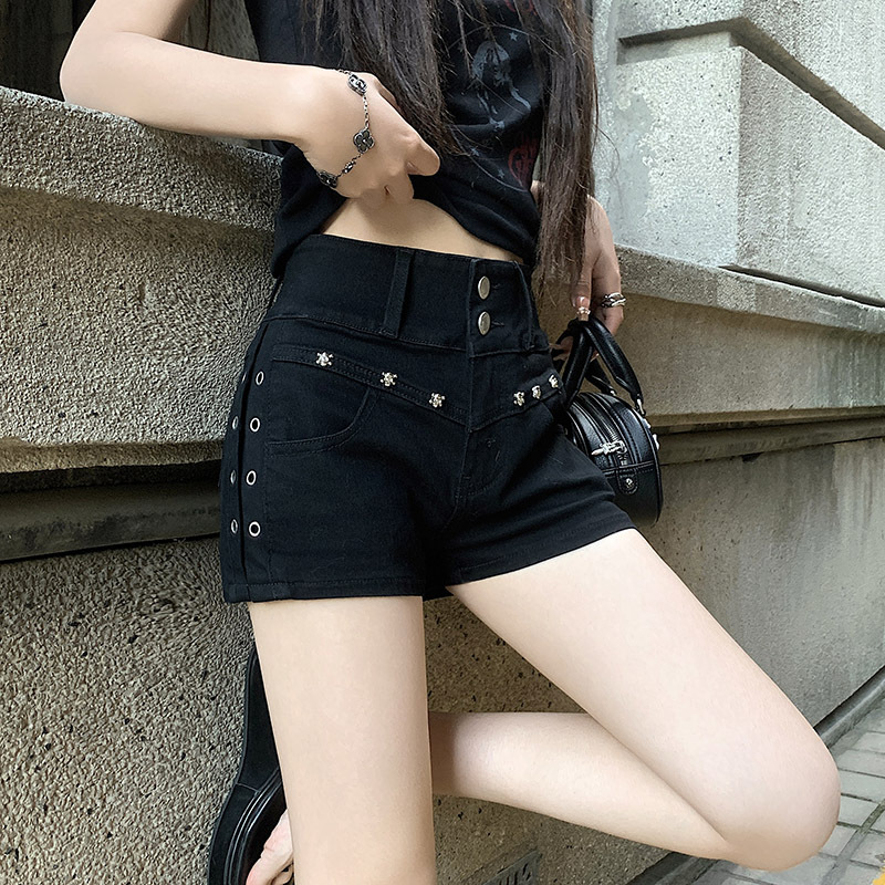[Today Yin] 2024 Summer American Spice Girls High Waist Double Buckle Black Denim Shorts Women's Hip Willow Nail Hot Pants