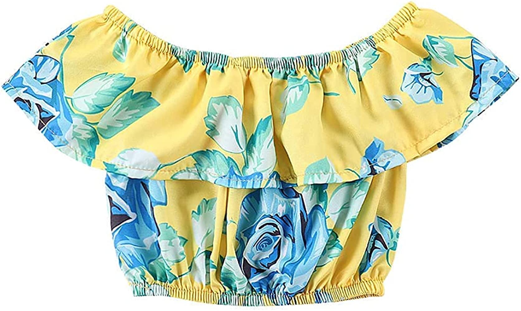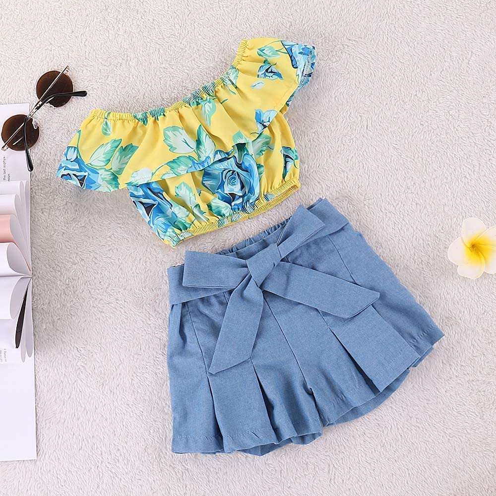 | nameOriginal | Kids Baby Girls Outfits Floral Ruffle Off Shoulder Crop Tops + Bowknot Denim Shorts Skirt Set Toddler Summer Clothes |