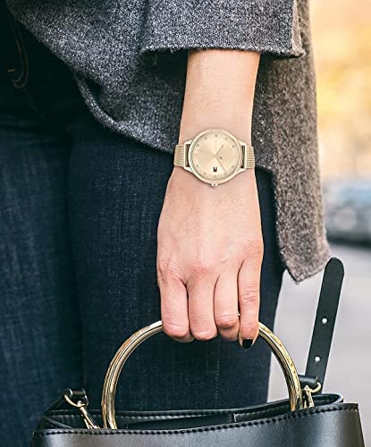 Introducing the Tommy Hilfiger Grace Women’s Light Carnation Gold Dial Watch – a stunning timepiece that exudes elegance and sophistication. The watch features a beautiful light carnation gold dial that is complemented by a sleek gold-tone stainless steel bracelet. The dial is adorned with gold-tone hour markers and hands, making it easy to read the time at a glance. The watch is powered by a reliable quartz movement and is water-resistant up to 30 meters, making it suitable for everyday wear. Whether you’re dressing up for a special occasion or simply running errands, this Tommy Hilfiger watch is the perfect accessory to elevate any outfit.