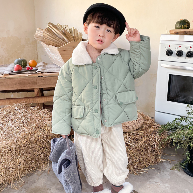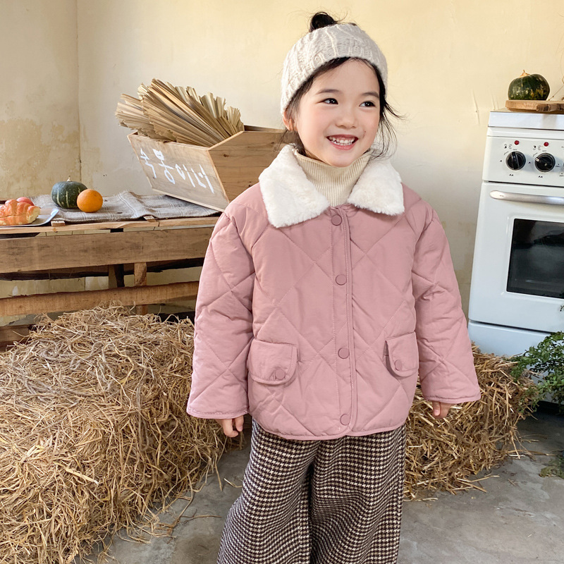 Tong Luoke Korean style children's cotton-padded clothes children's diamond plaid cotton-padded clothes children's thickened warm fur collar foreign trade children's clothing wholesale
