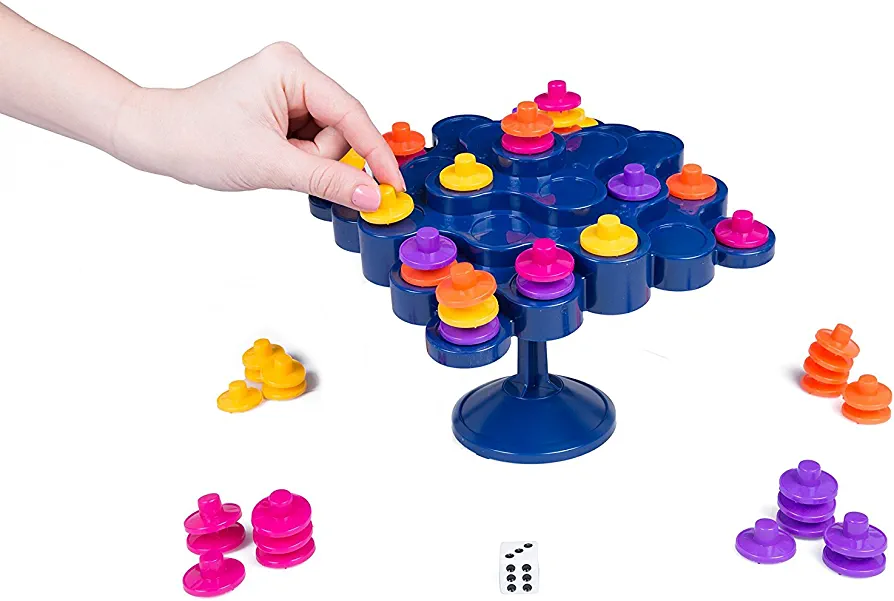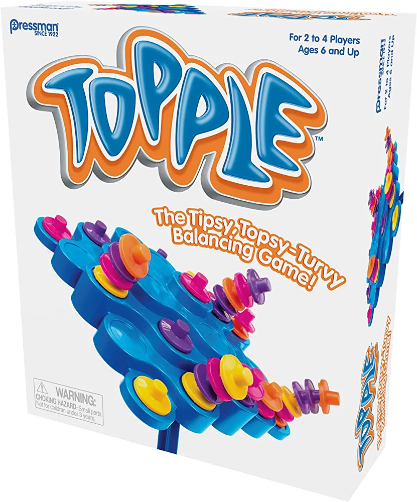 | descriptionOriginal | Description Topple is a three-dimensional board game for the whole family. To play, perch the game board (a five-level, 8-inch square of molded plastic) on top of the 7-inch- high stand, choose your color piece, and agree on what score will win. Each player then rolls a die and must place a piece on the game board level that corresponds to the number rolled. Points are scored by completing rows or building high stacks. The round ends and you get a point penalty if you send pieces cascading off the platform–that is, cause a topple. Younger children can play without scoring, with players being eliminated as they cause topples. –Richard Farr Product Description A little luck and a steady hand will make you a winner in this exciting balancing game that reinforces STEM skills! Players take turns rolling the die and placing pieces on the different levels of the tipsy topply game unit. Watch out…as more pieces are added the tower rotates, tips, and sways. Don't be the one that makes all the pieces come toppling down! To win, complete a row of five, or stack your pieces 4 or more high. Great for spatial relationships, math skills, and simple building Topple includes: 48 playing pieces, a sturdy plastic Topple tower and stand, game die and complete instructions. For 2-4 players ages 6 and up. From the Manufacturer A little luck and a steady hand will make you a winner in this exciting balancing game that reinforces STEM skills! Players take turns rolling the die and placing pieces on the different levels of the tipsy topply game unit. Watch out…as more pieces are added the tower rotates, tips, and sways. Don't be the one that makes all the pieces come toppling down! To win, complete a row of five, or stack your pieces 4 or more high. Great for spatial relationships, math skills, and simple building Topple includes: 48 playing pieces, a sturdy plastic Topple tower and stand, game die and complete instructions. For 2-4 players ages 6 and up. |